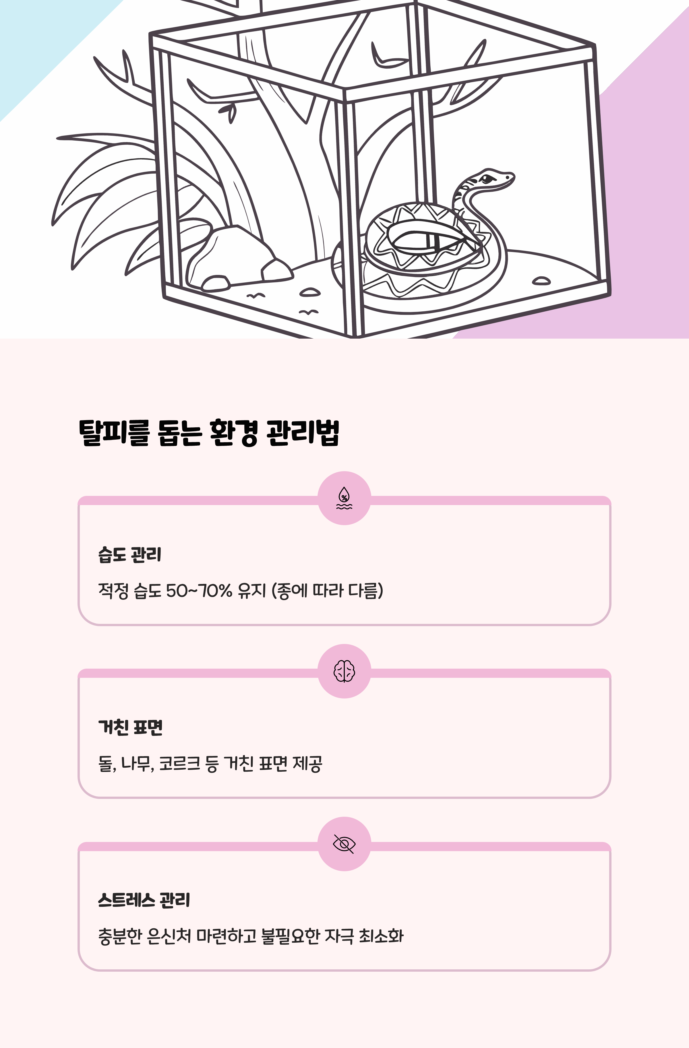 적절한 습도 유지: 탈피를 돕는 가장 중요한 환경 조건입니다. 케이지 안의 습도를 60~80% 수준으로 유지하세요.거친 표면 제공: 탈피 중 뱀이 문지를 수 있도록 깨끗한 유목이나 바위 등 마찰면을 주세요.탈피 중 최소한의 접촉: 민감한 시기이므로 지나친 스트레스를 주지 않도록 조심합니다.뱀 상태 지속 관찰: 탈피 전후 식욕, 행동 등을 주의 깊게 확인하세요.