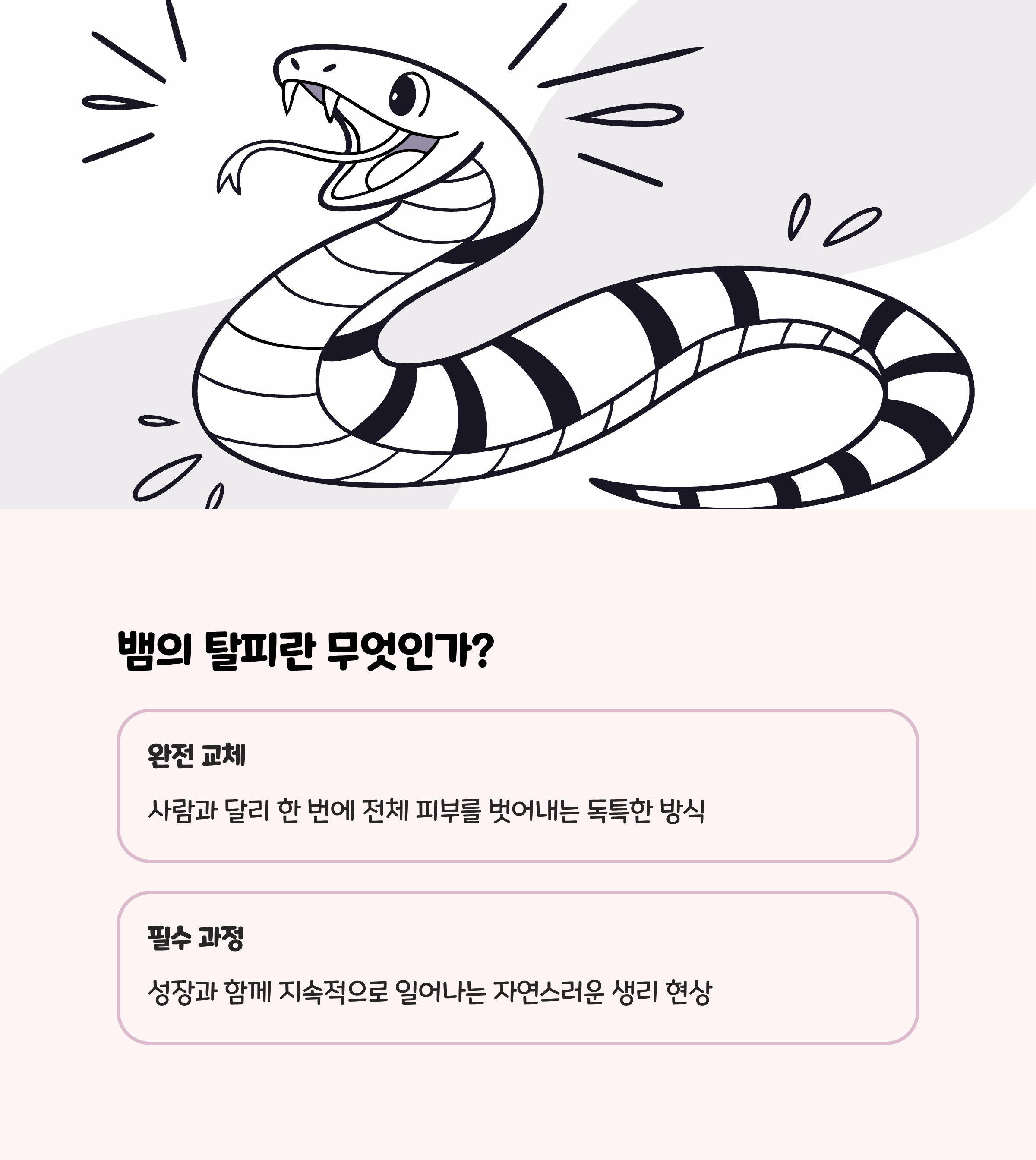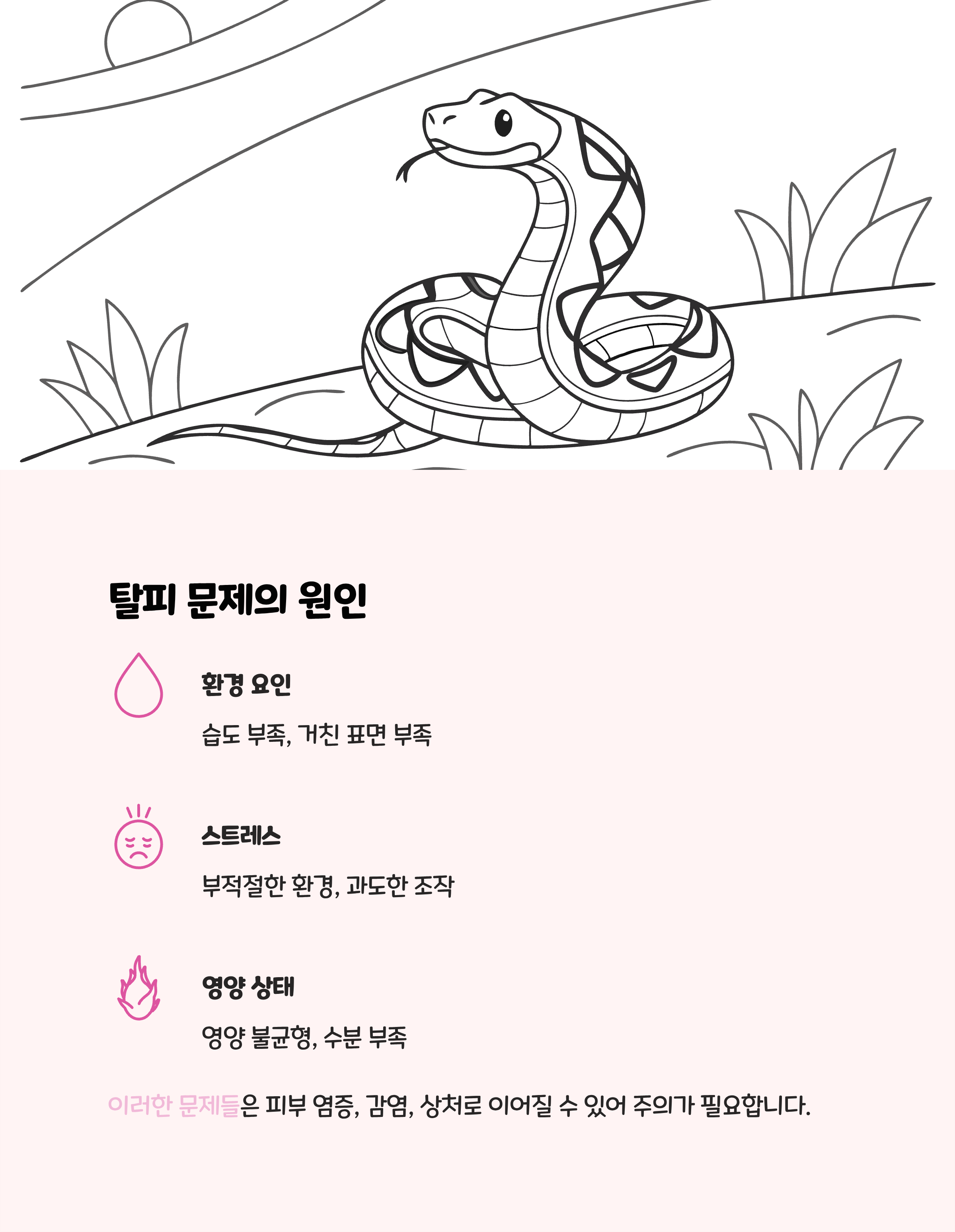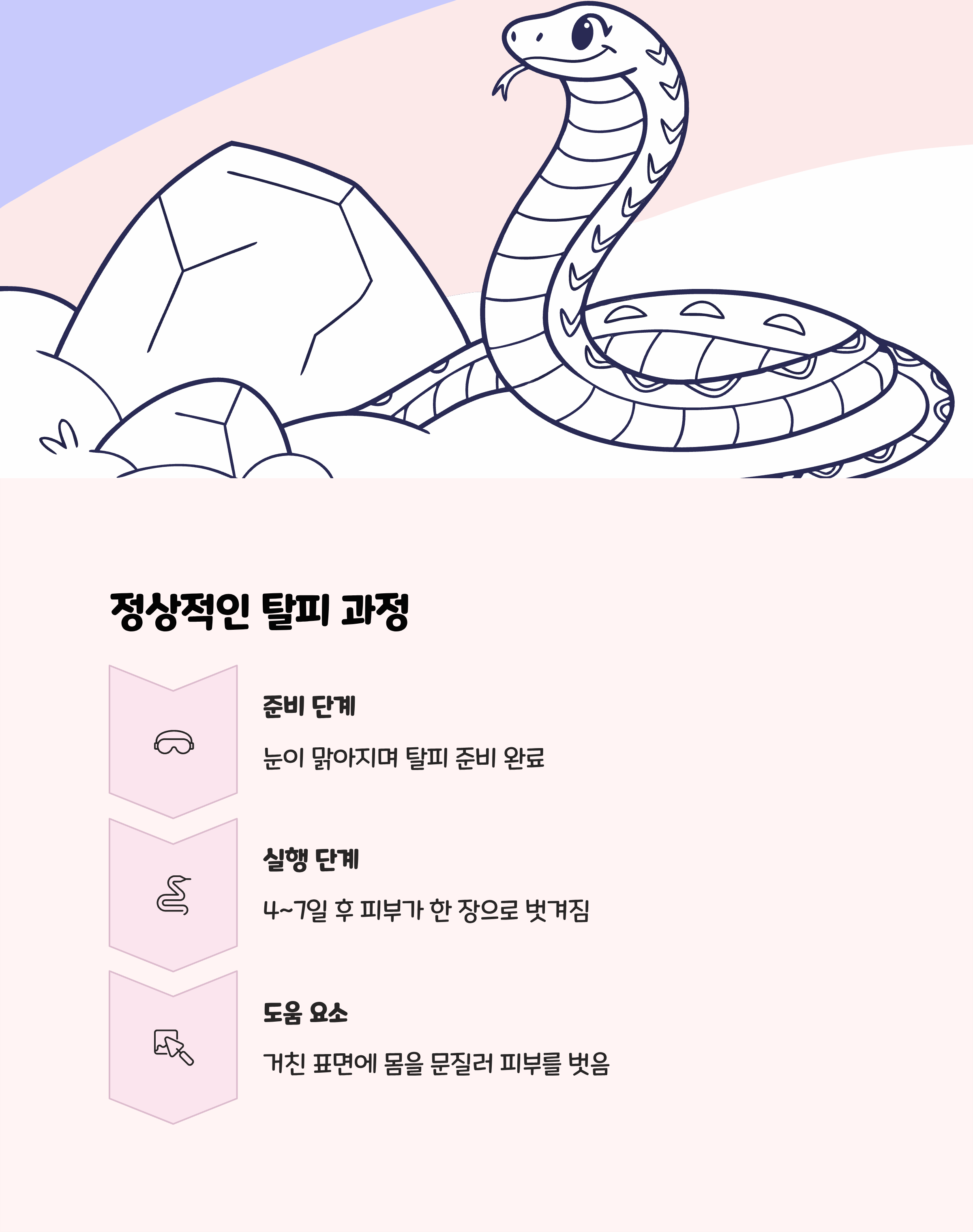 뱀은 피부가 자라지 않고 오래되기 때문에 주기적으로 허물을 벗어야 합니다. 탈피는 성장과 건강 유지에 필수적이며, 상처치유와 기생충 제거에도 도움을 줍니다. 탈피 전에는 눈이 흐려지고 피부가 칙칙해져 정상적인 변화가 나타납니다.