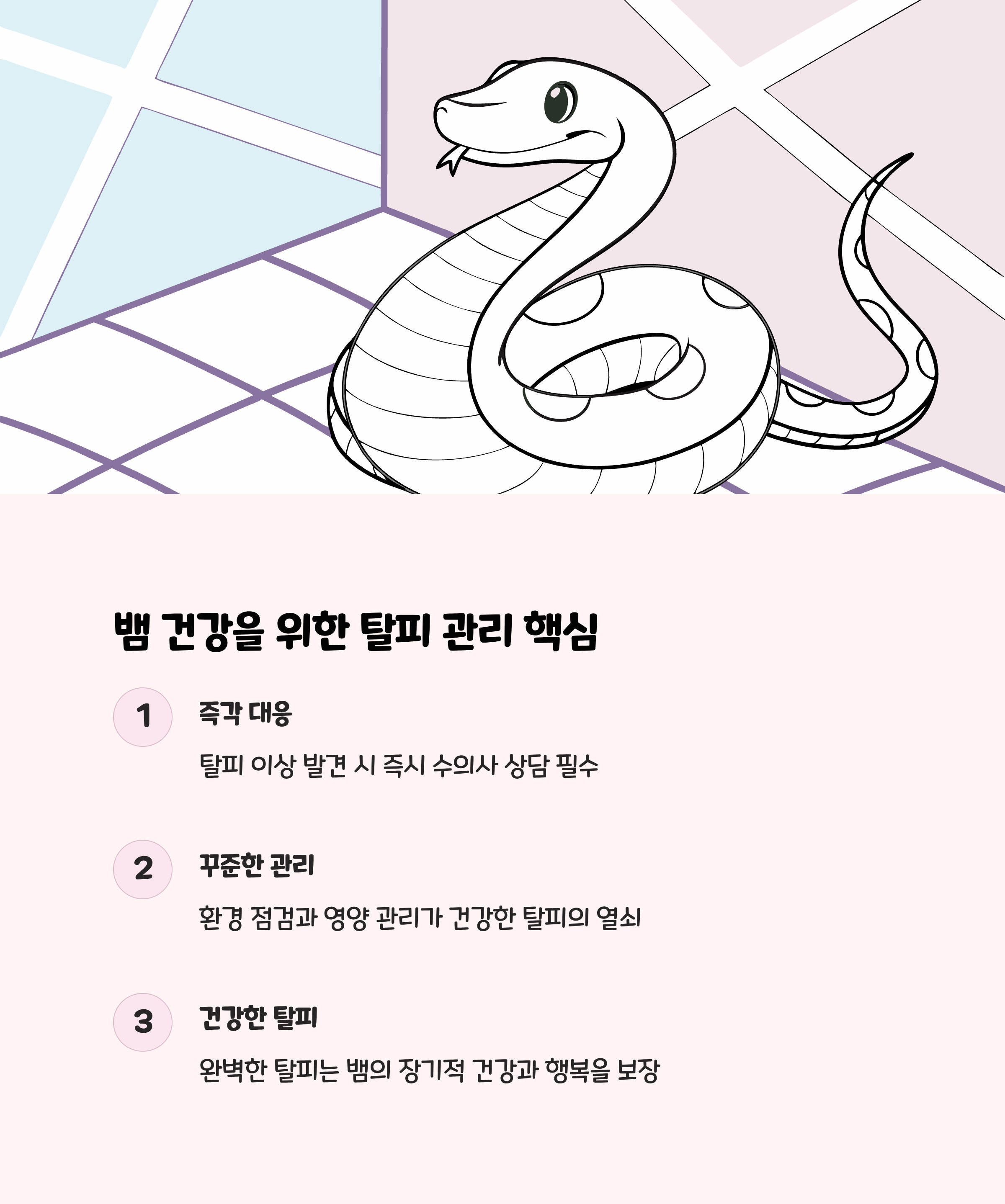 뱀의 탈피는 생명 유지에 중요한 자연 과정이나, 이상 신호를 무시하면 피부 감염, 혈액순환 문제, 시력 손상, 심하면 신체 상해 및 사망으로 이어질 수 있으므로 빠른 병원 진료가 필수적입니다. 평소 뱀 상태를 세심하게 관찰하고, 탈피 중 이상 징후 발견 시 바로 수의사와 상담해 주세요.