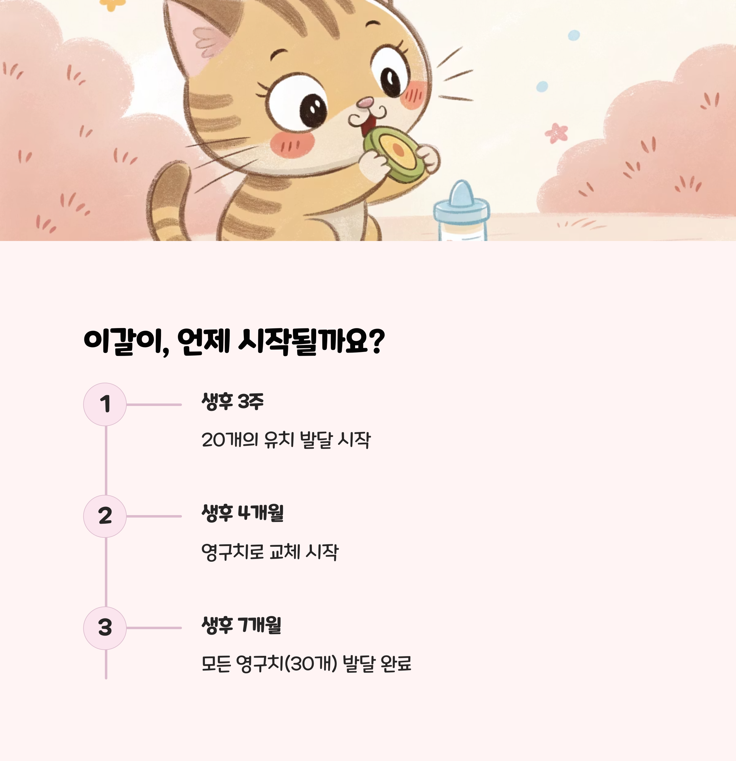 고양이의 이갈이 시기는 성장 과정에서 반드시 거쳐야 하는 자연스러운 변화입니다. 하지만 이 시기 고양이의 행동 변화와 건강 신호를 잘 관찰하고, 올바른 관리법을 실천하는 것이 평생 건강을 좌우합니다. 집사의 세심한 관심과 적절한 대처가 고양이의 건강한 성묘 시절로 가는 첫걸음이 될 것입니다.