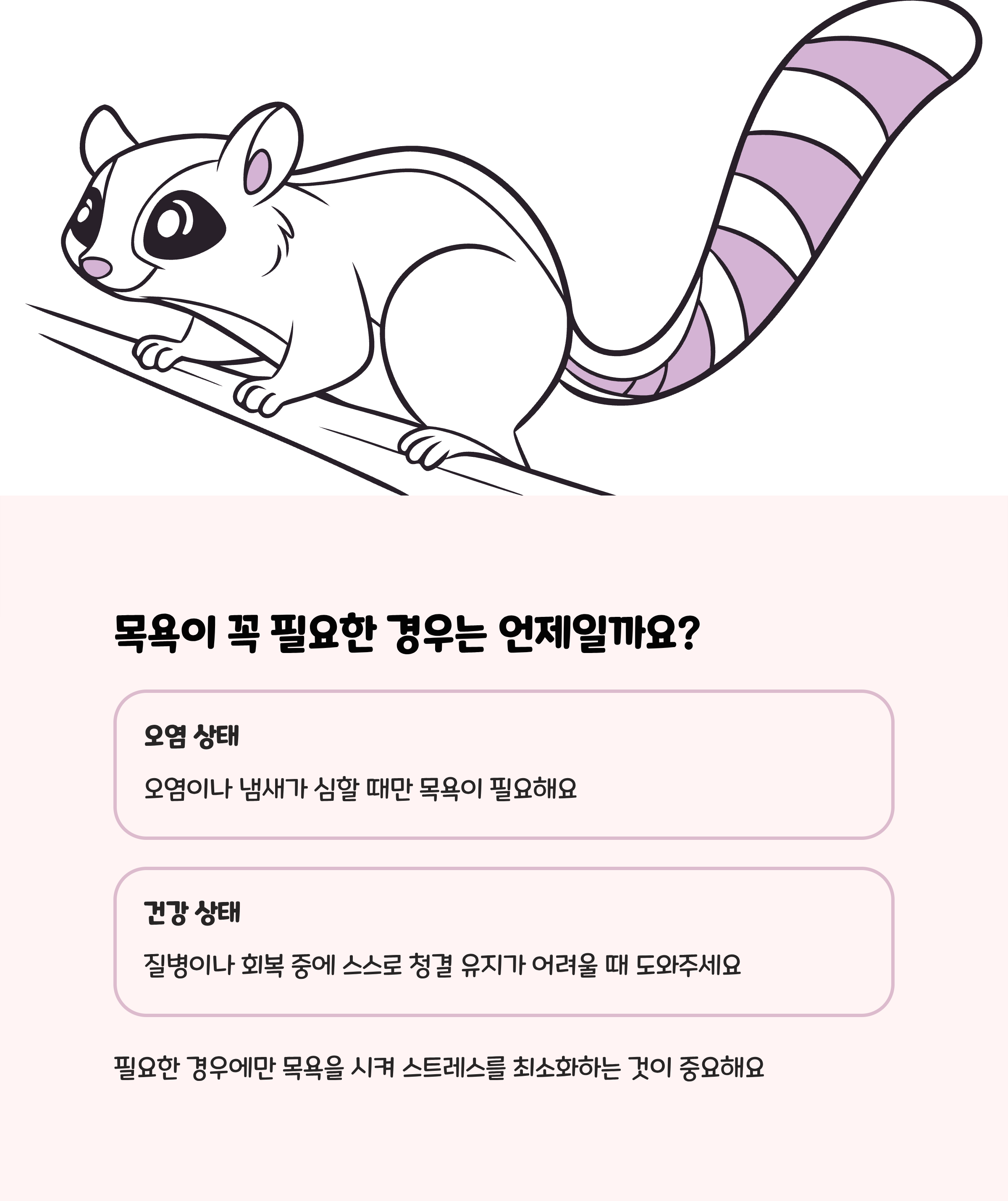 | 목욕 횟수 | 자주 하지 않고 냄새나 오염 시만 시행 | 과도한 목욕은 피부 건조 및 스트레스 유발 |