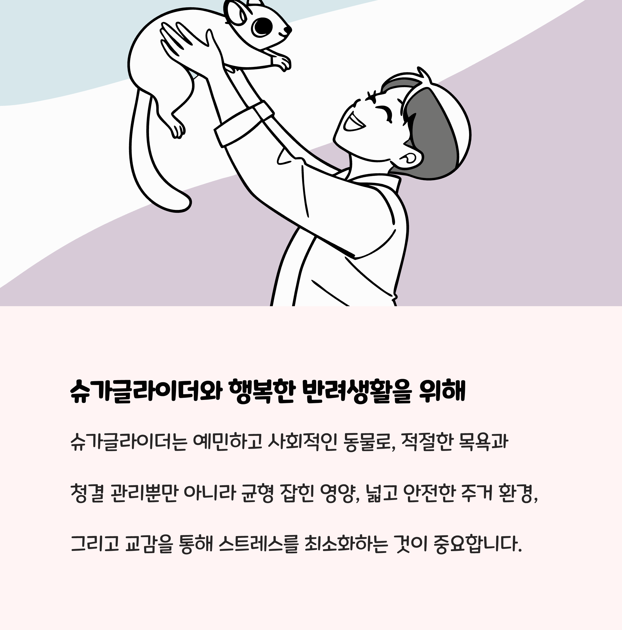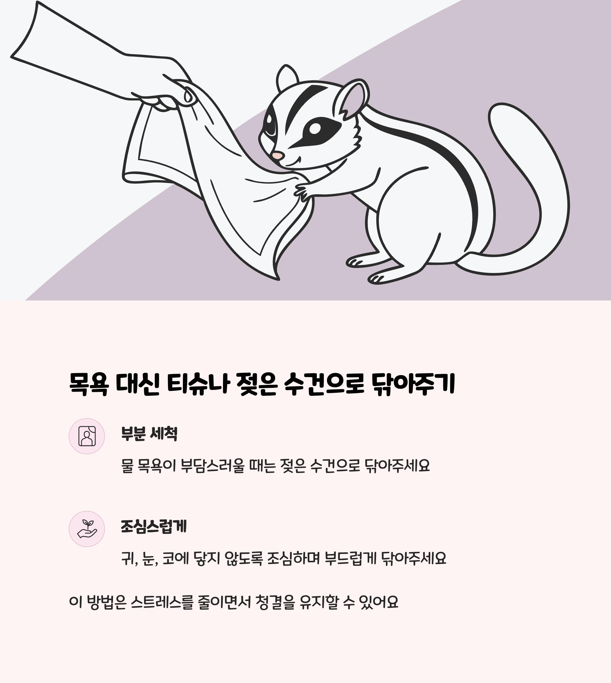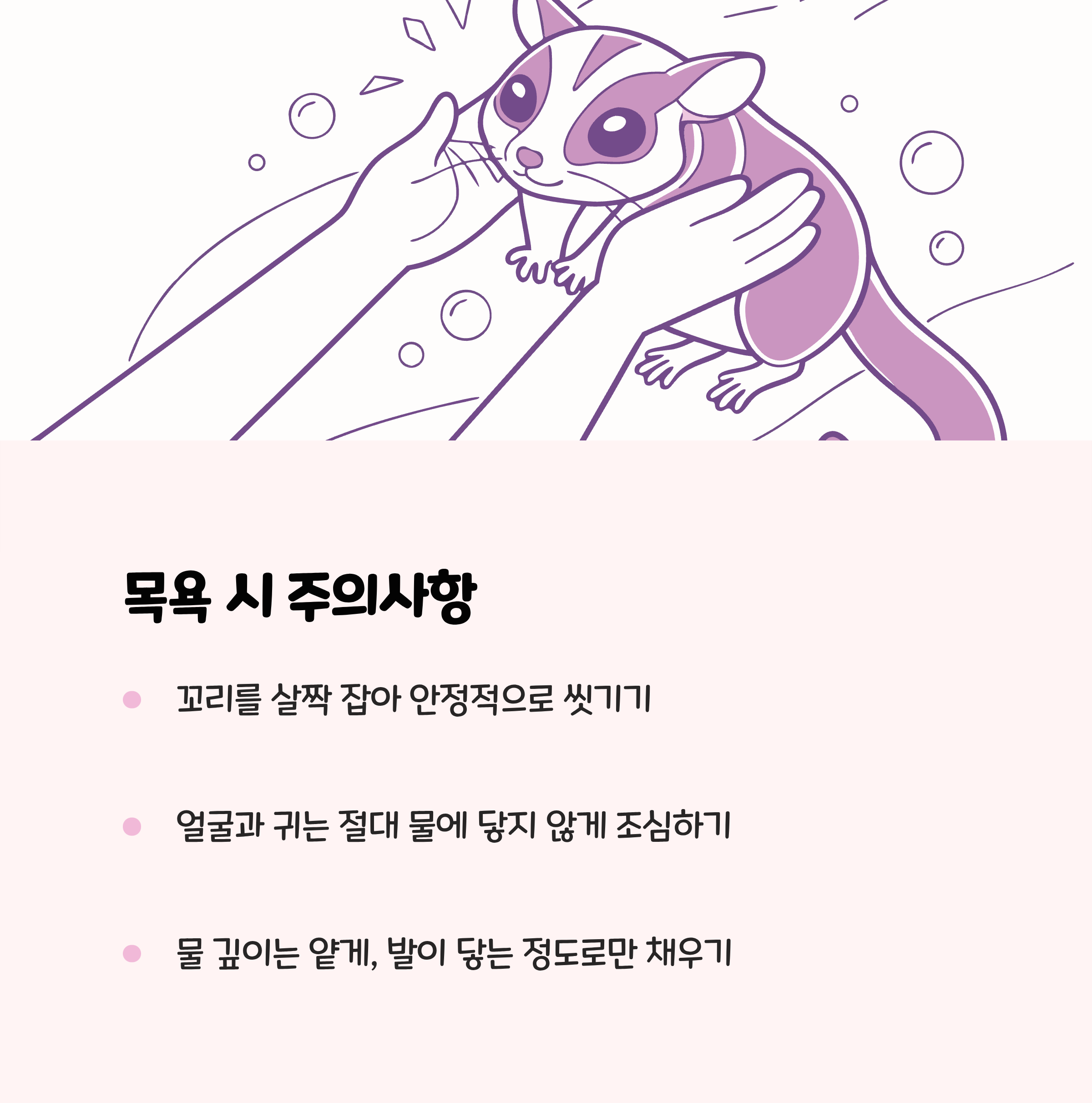 목욕 빈도는 너무 잦지 않게, 심한 냄새나 오염이 있을 때만 진행하는 것이 좋습니다.- 슈가글라이더는 스트레스를 받을 수 있으니 최대한 조용하고 안정된 환경에서 진행하세요.