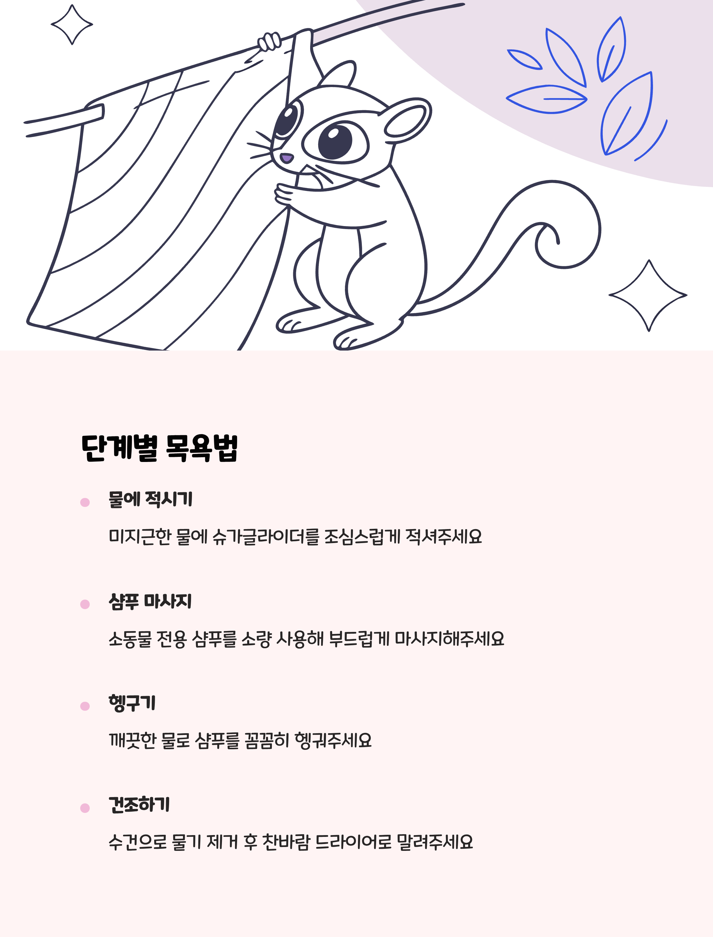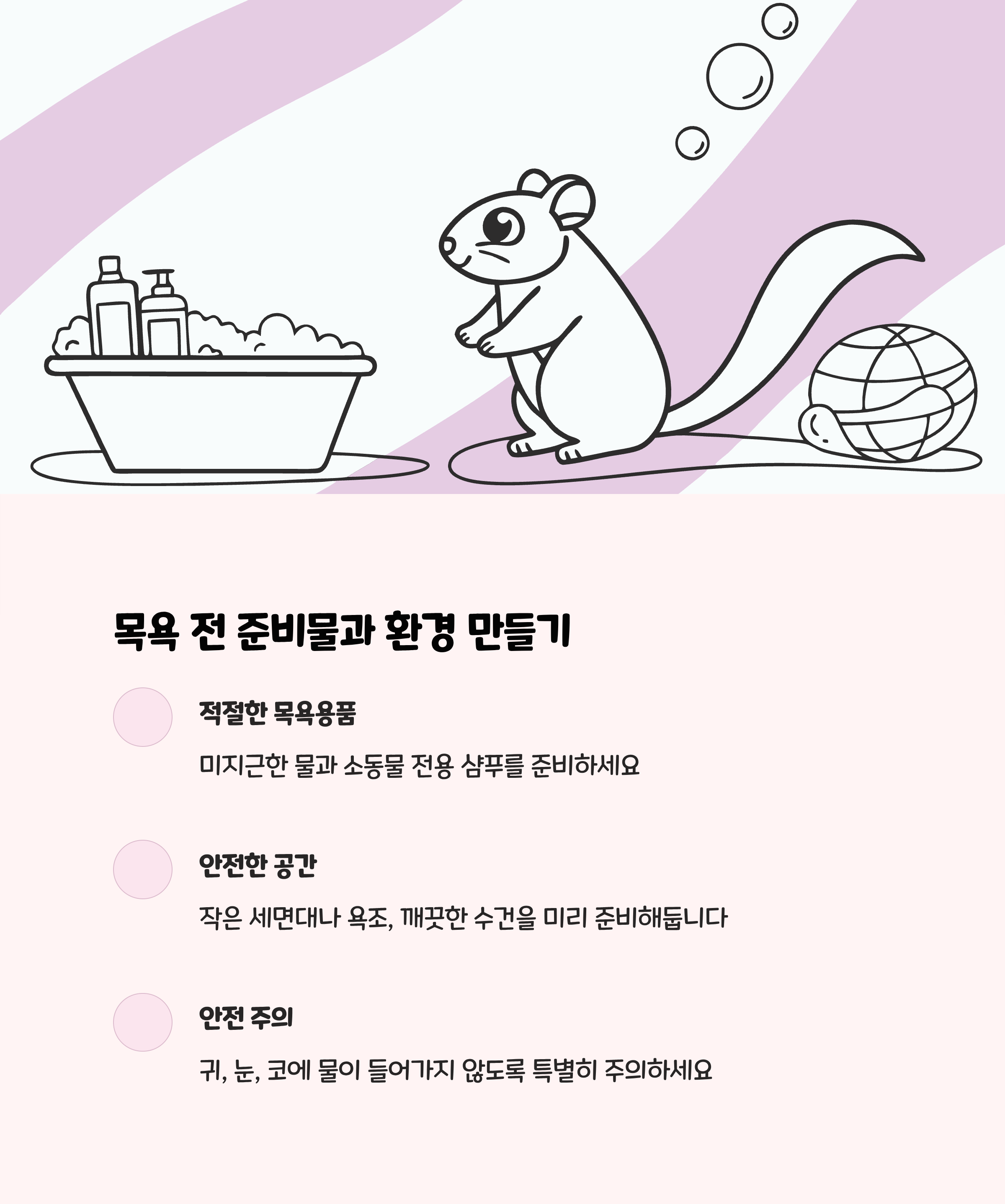 | 샴푸 종류 | 소동물 전용 저자극 샴푸 | 인간 샴푸나 일반 샴푸는 절대 사용 금지 |