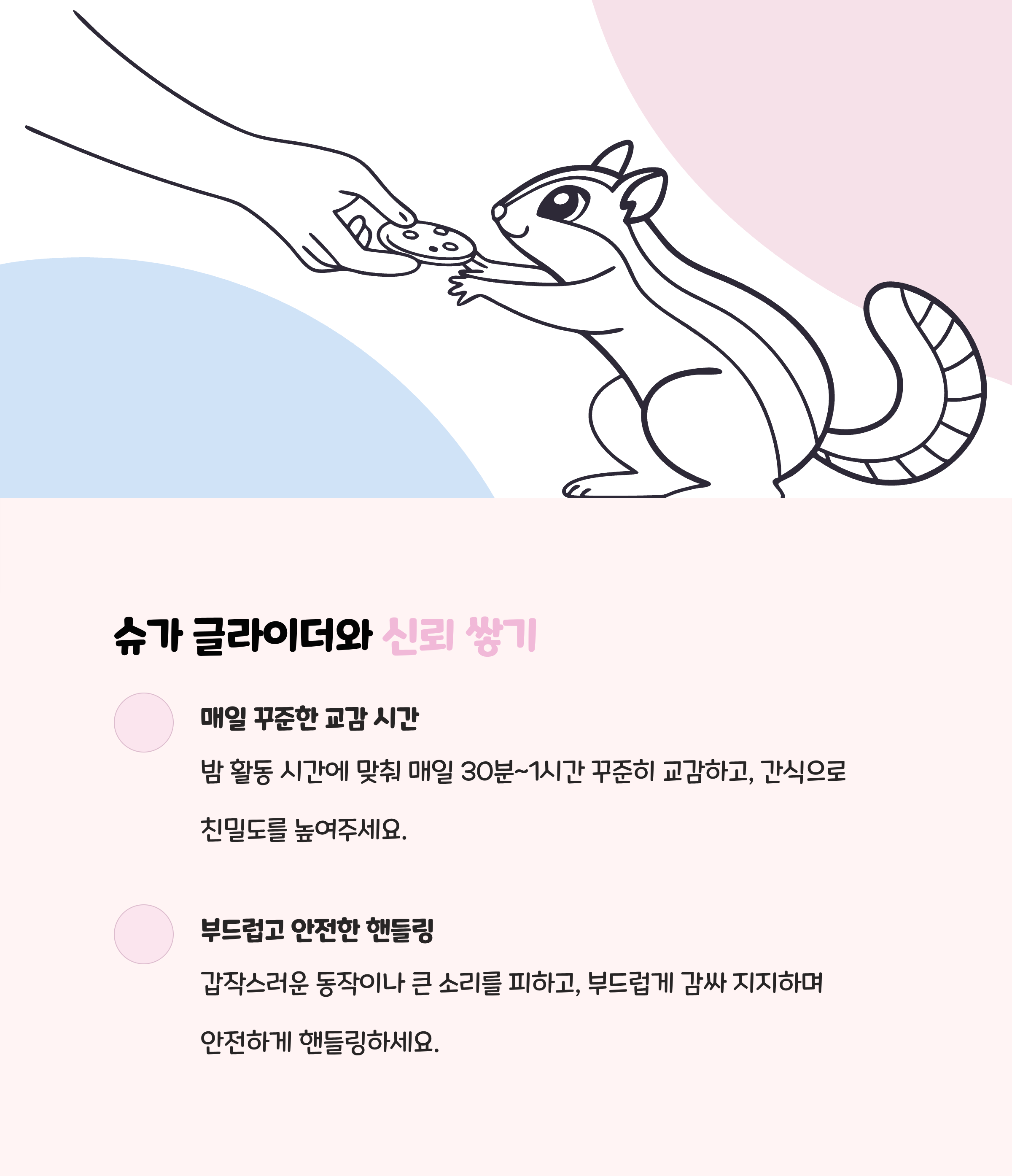핸들링은 적응 기간(3~7일) 이후에 시작하며, 처음에는 슈가 글라이더가 편안함을 느낄 수 있는 파우치나 옷 주머니에 넣고 함께 시간을 보내면서 점차 직접 손 위에 올리는 방식으로 진행합니다.