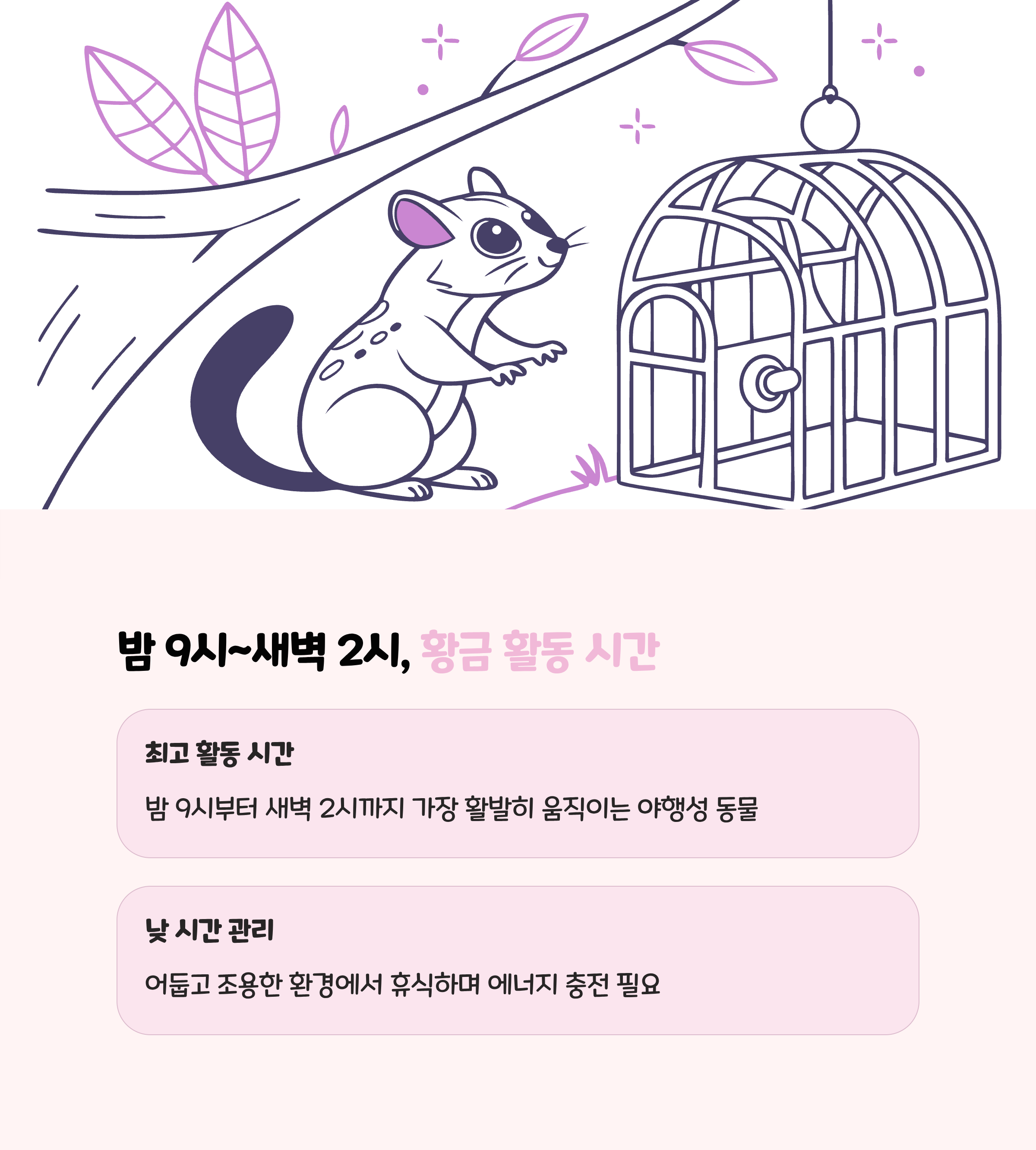 야행성 활동 시간: 밤 9시~새벽 2시가 가장 활발낮 시간: 대부분 휴식 혹은 수면환경: 조용하고 어둡고 안정적인 환경 필요