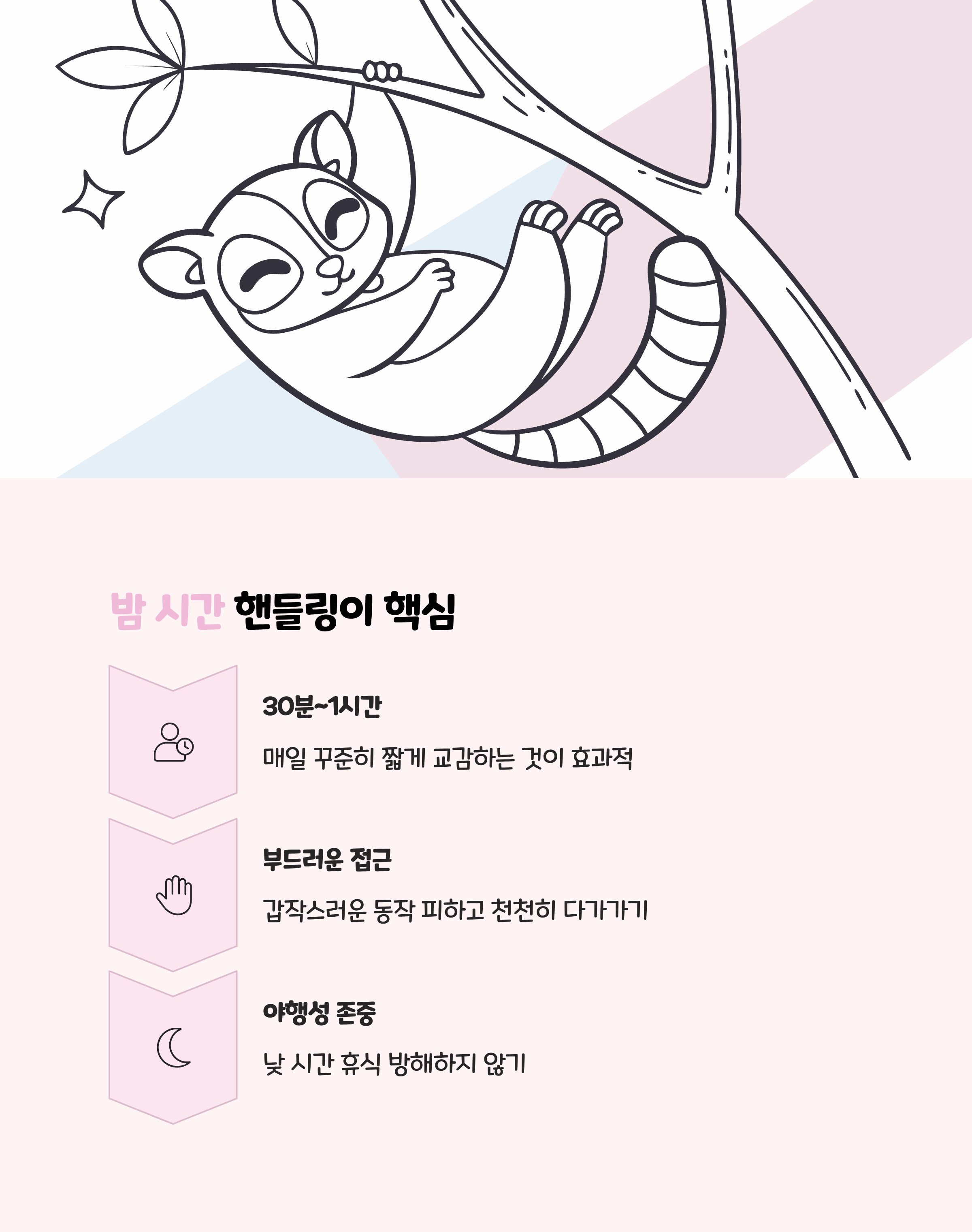| 휴식 시간 | 주간 거의 잠 또는 휴식 | 조용하고 어두운 환경 필요 |