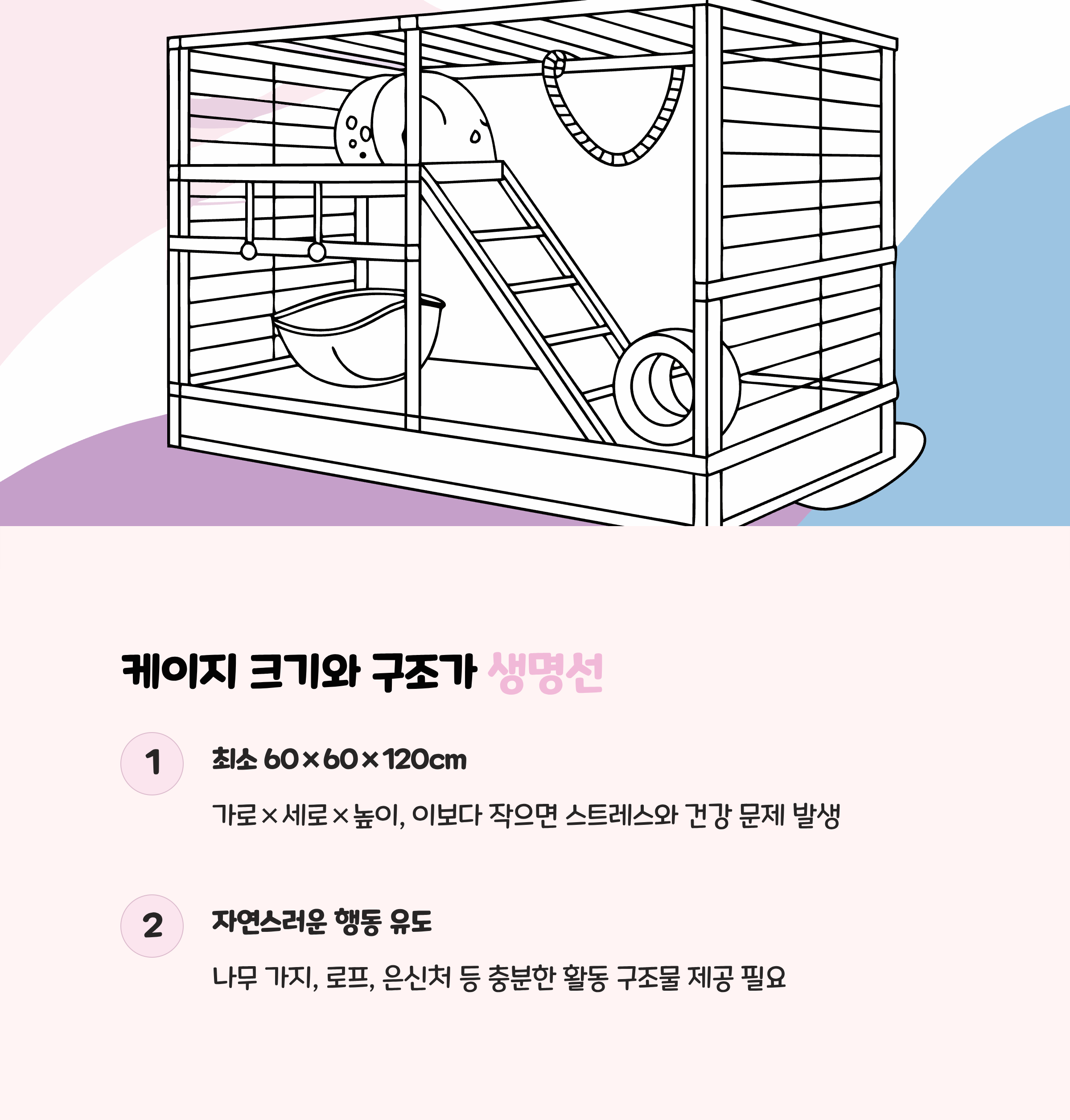 | 케이지 크기 | 최소 60cm x 60cm x 120cm 이상 | 수직 이동 공간 확보 중요 |