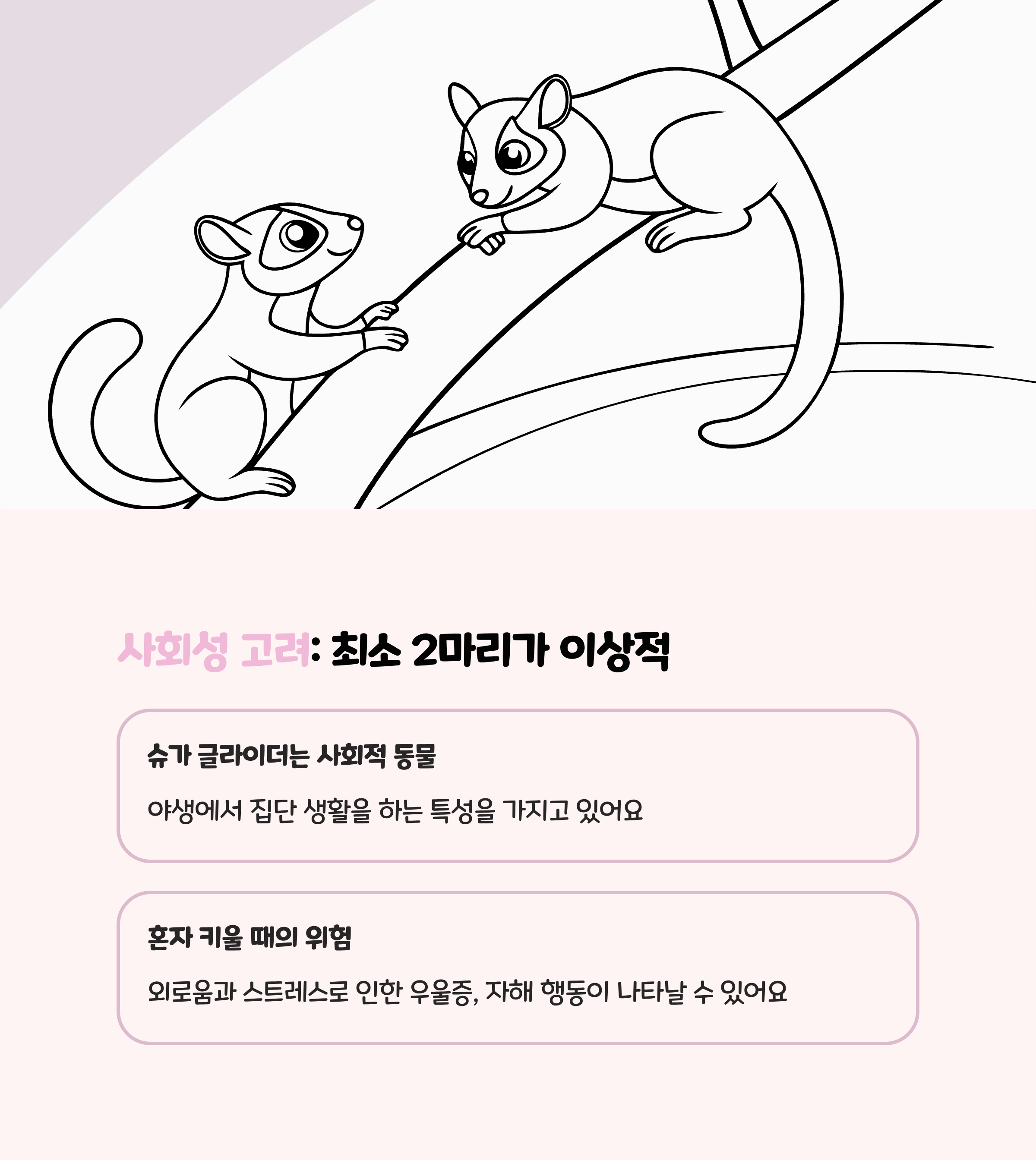 권장하지 않습니다. 슈가 글라이더는 사회성이 강한 동물이라 혼자 있으면 외로움과 스트레스가 심해질 수 있습니다. 최소 2마리 이상 함께 사육하는 것이 정서 안정과 활동성 유지에 도움 됩니다.