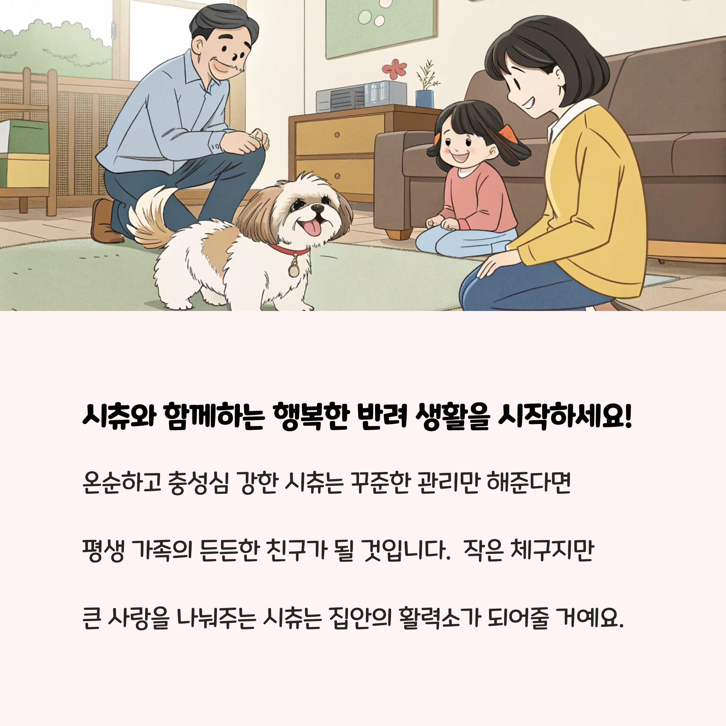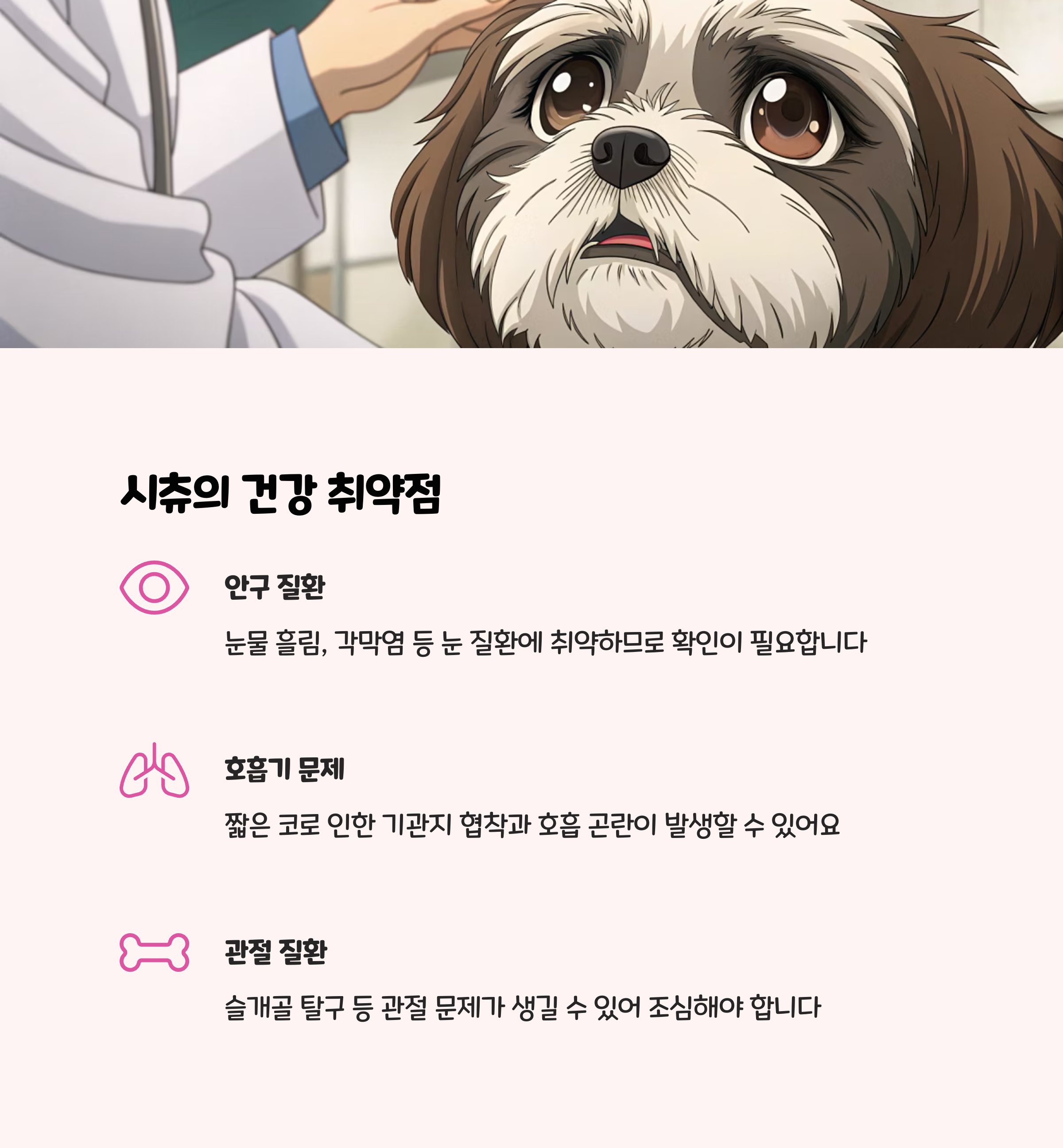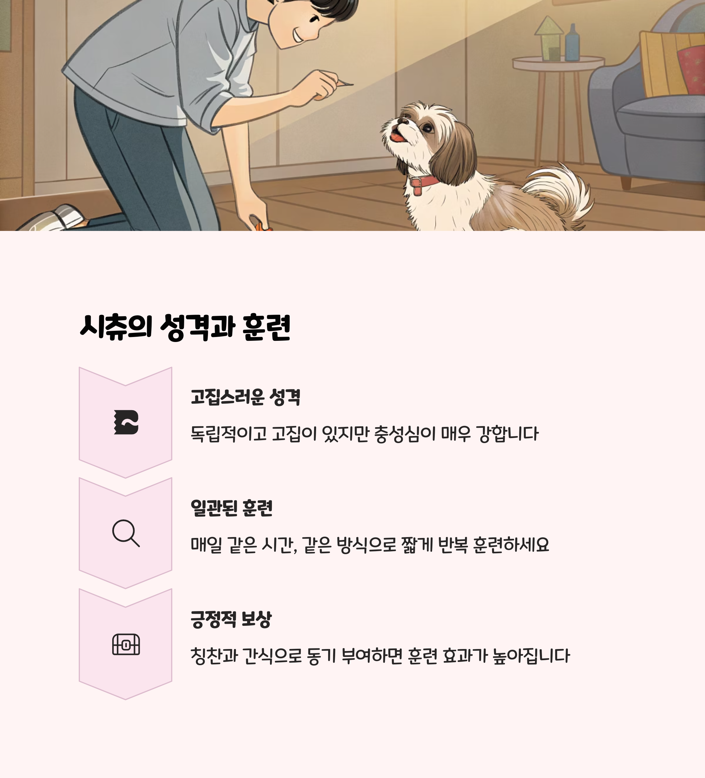 본 내용은 한국동물보건협회(대한민국반려동물관리사협회)에서 제공하는 시츄 건강관리 가이드, 그리고 시츄의 성격, 관리법, 주의사항 등을 다룬 전문 반려동물 정보 사이트와 블로그(인마이러브펫, 완페디아, 둥글둥글 순한 시츄 등)의 정보를 종합하여 작성되었습니다.