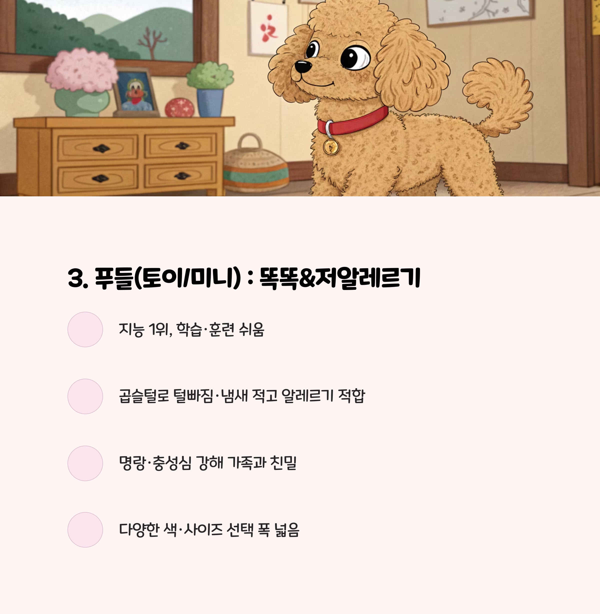 특징: 곱슬 털, 높은 지능, 훈련이 쉬움장점: 털이 잘 빠지지 않아 알레르기 걱정 ↓, 다양한 크기(토이/미니) 선택 가능유의점: 정기적 미용과 꾸준한 운동 필요