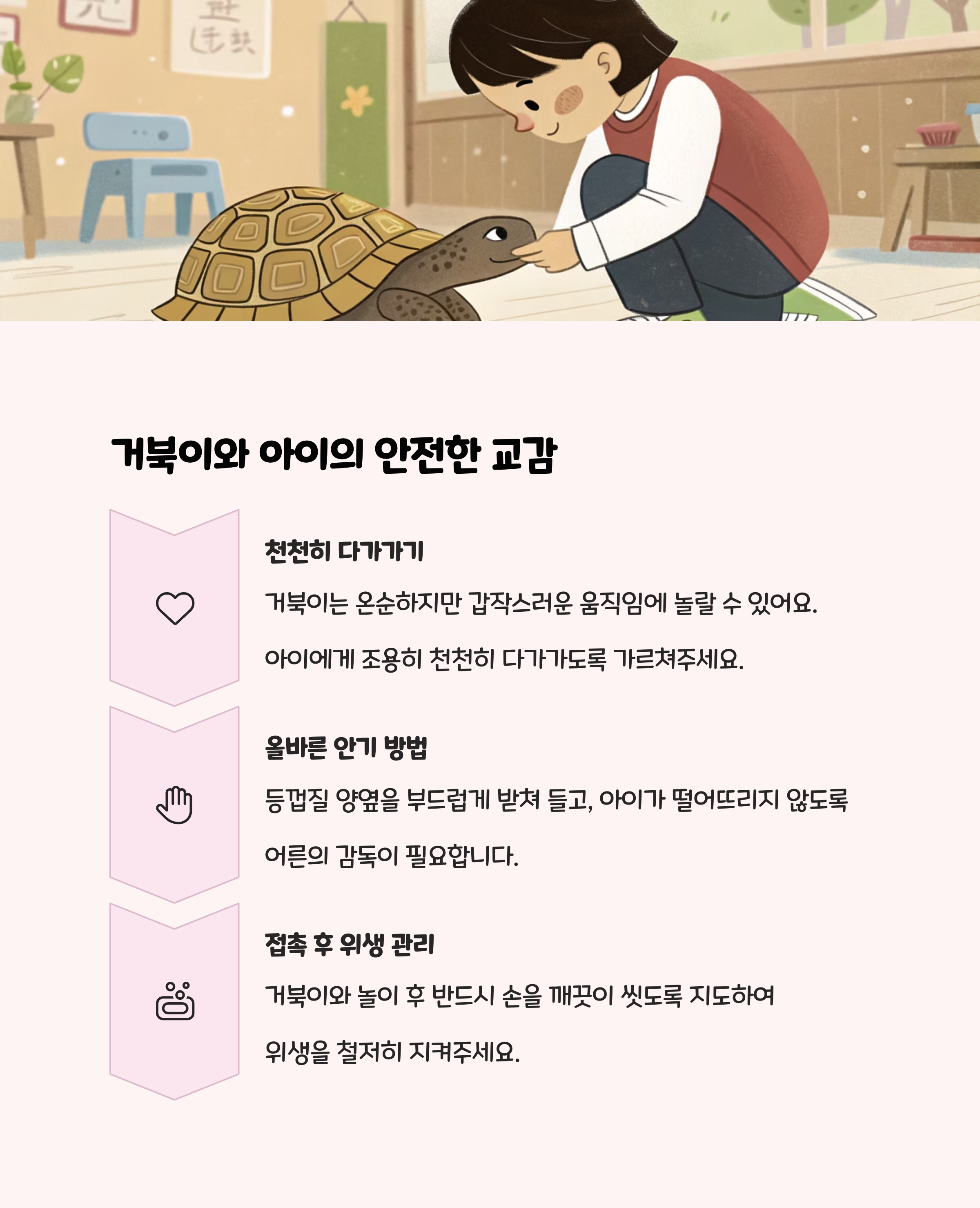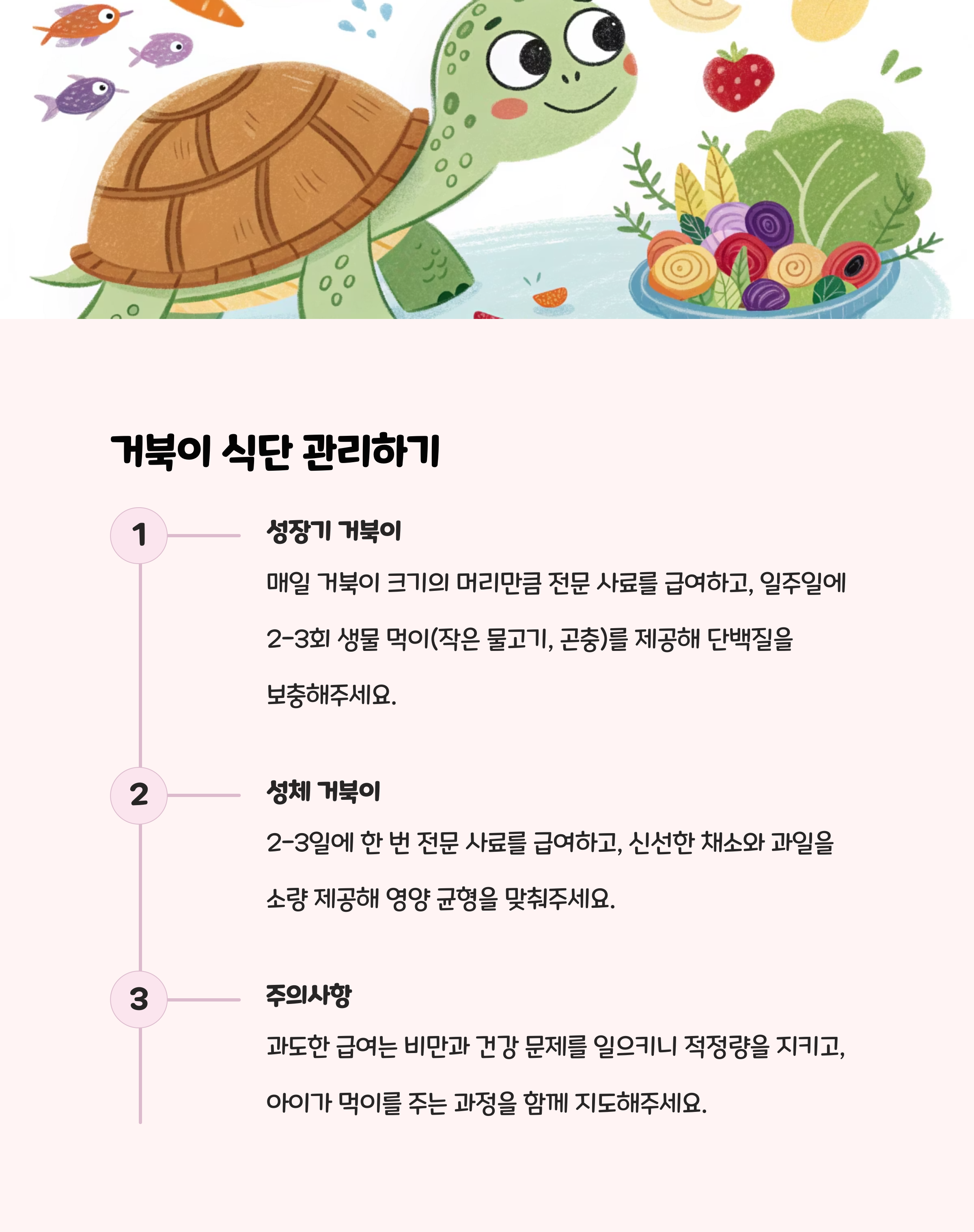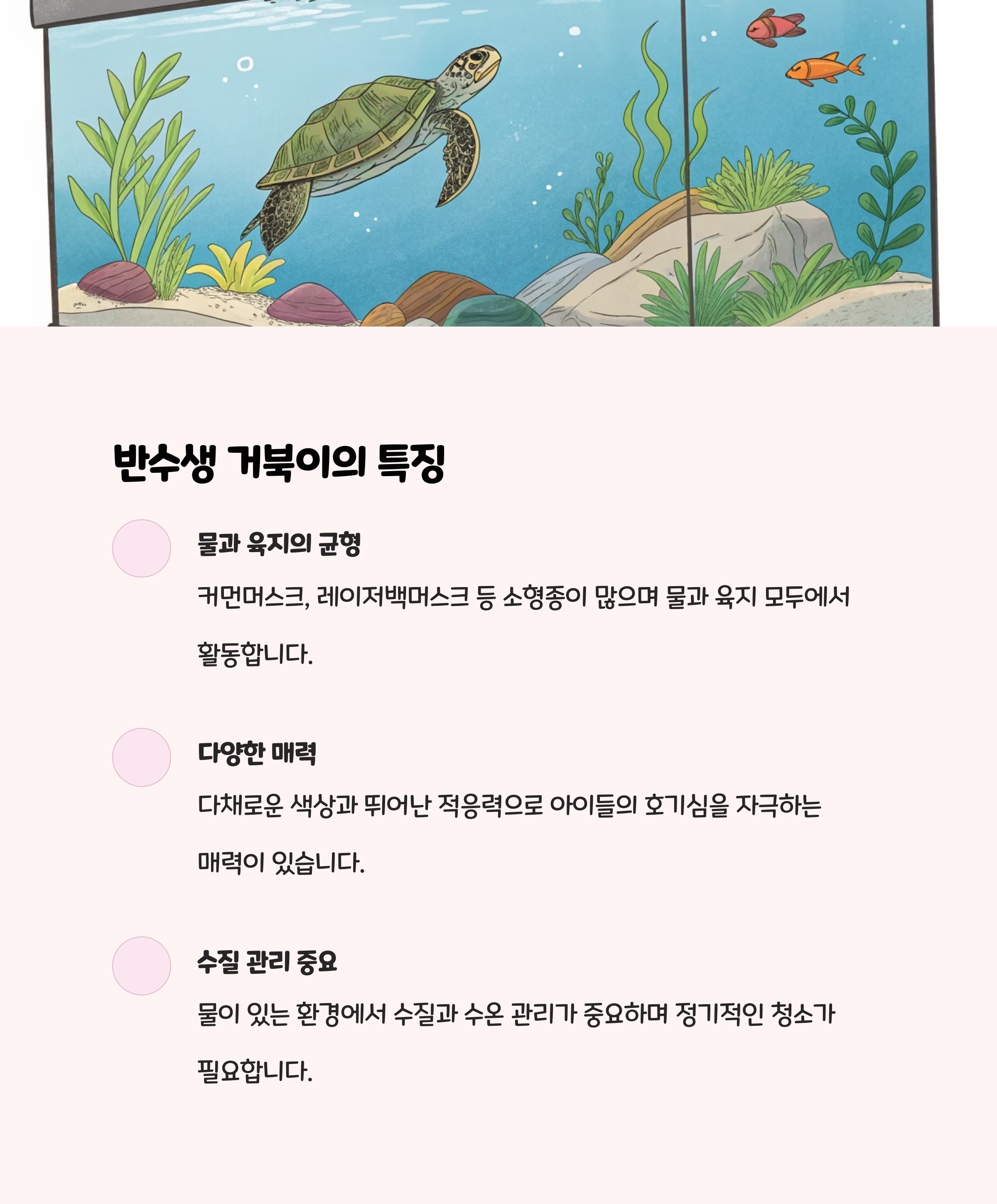 - 거북이는 먹이 주기, 청소, 관찰 등 일상적인 관리가 패턴화 되어 아이와 역할을 나누기 좋습니다.