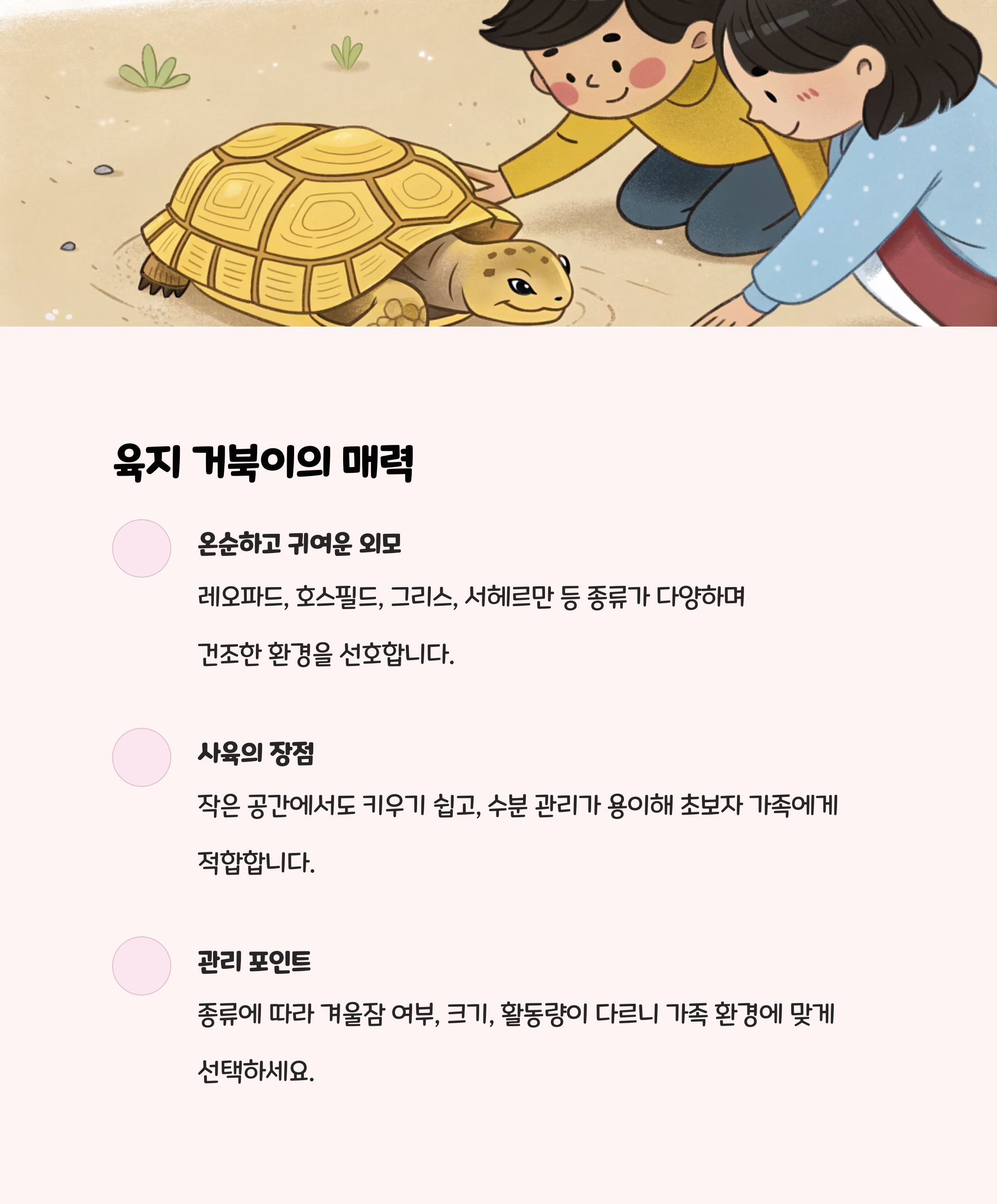 | 레오파드거북 | 얌전, 겨울잠 없음 | 온순, 환경만 맞추면 쉬움 | 넓은 공간 필요 |