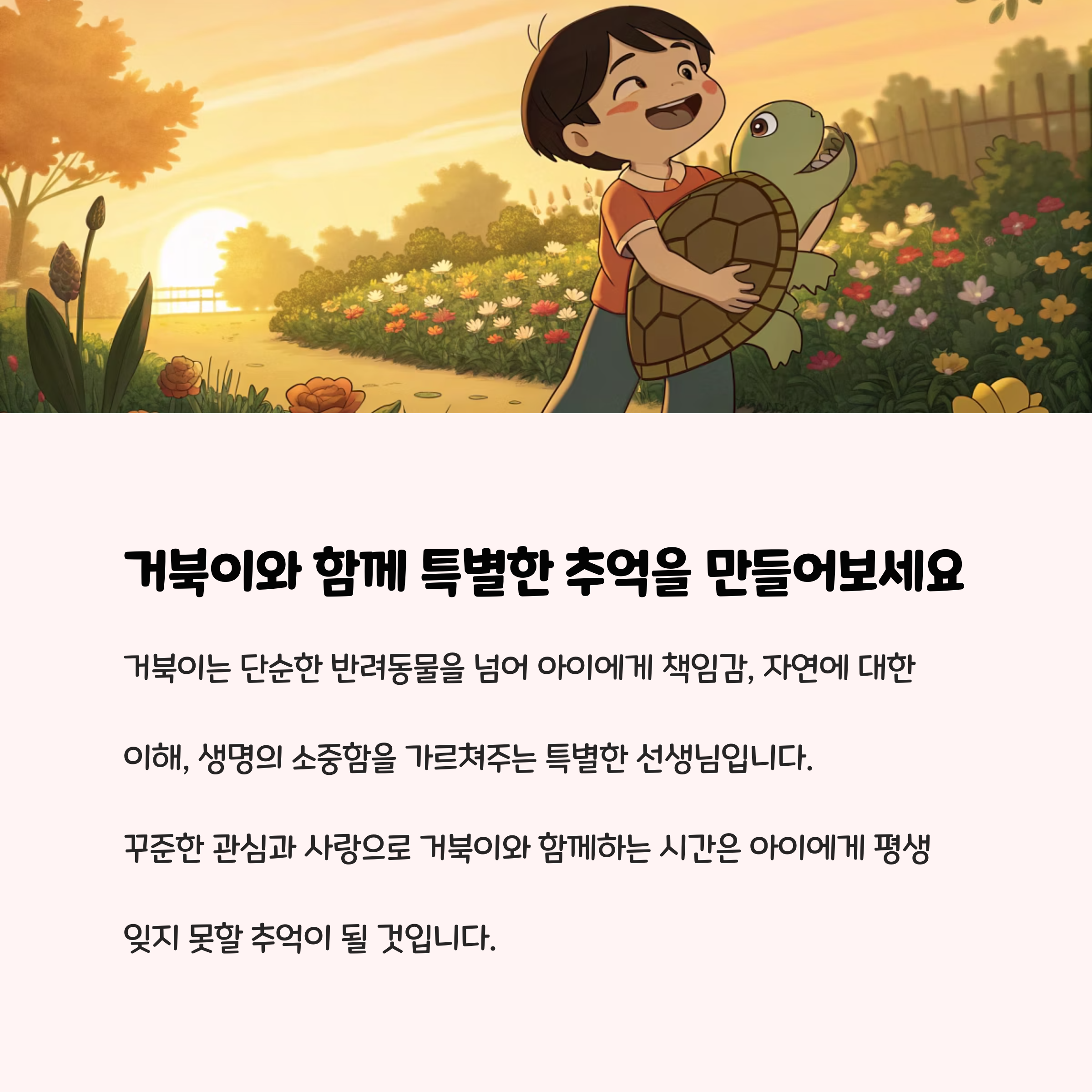 거북이는 한 번 입양하면 20년 이상 함께할 수 있는 평생 친구입니다. 아이와 함께라면 더욱 의미 있고, 자연과 생명에 대한 감수성을 키울 수 있는 특별한 경험이 될 것입니다. 입양 전 충분한 조사와 준비, 그리고 꾸준한 관심만 있다면, 거북이는 가족 모두에게 큰 기쁨을 줄 수 있습니다.