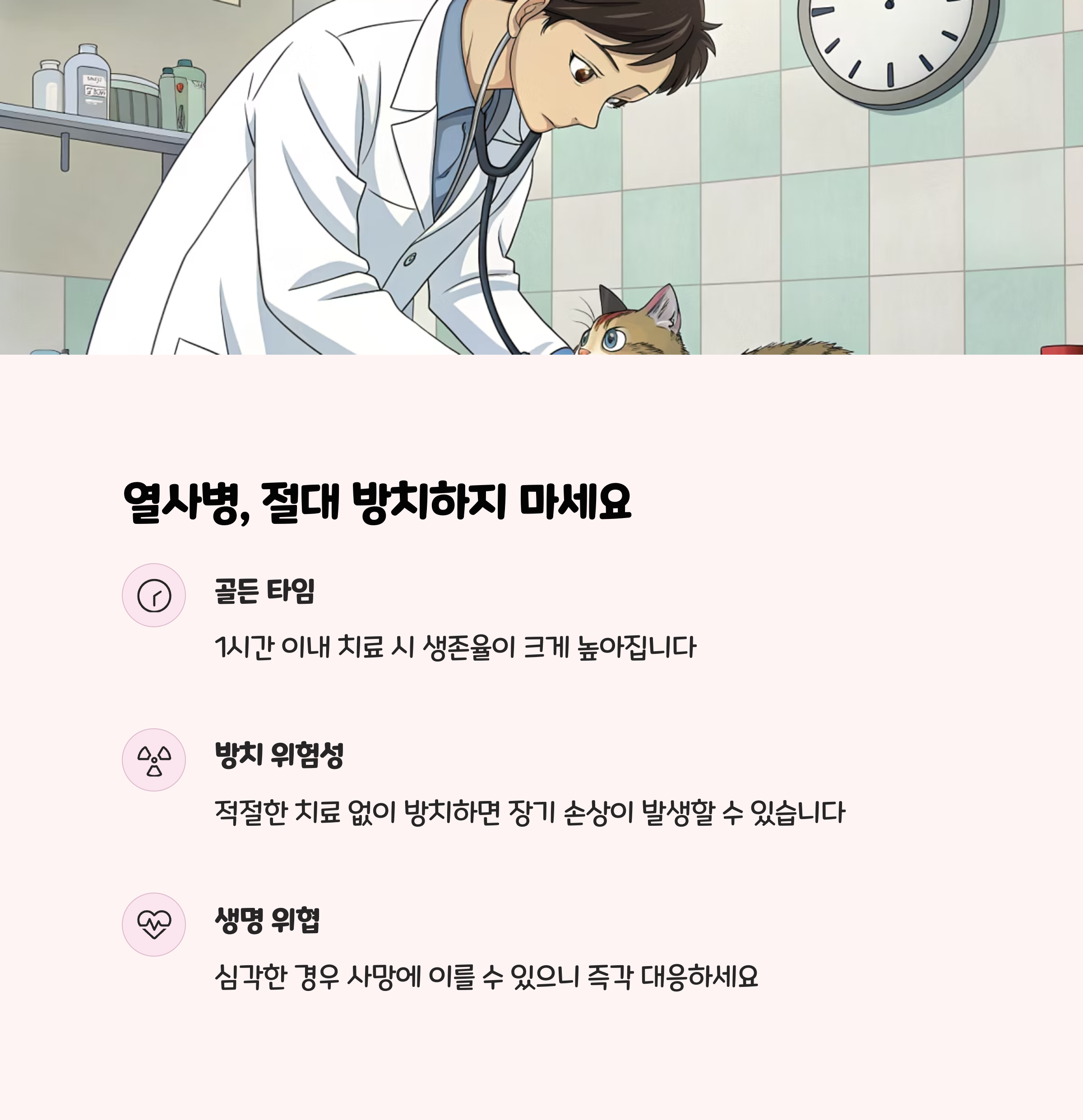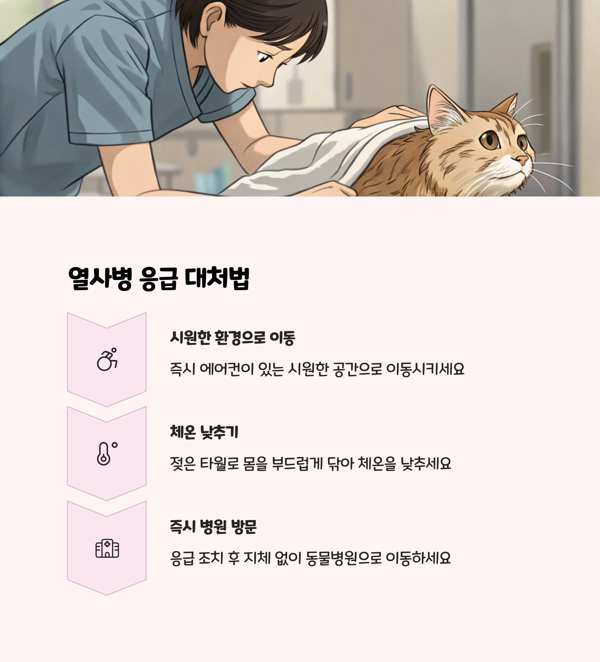 만약 고양이가 헥헥거림, 무기력, 구토, 의식 저하 등의 증상을 보인다면 즉시 실내 온도를 낮추고, 찬 물수건으로 몸을 닦아 체온을 낮춰주세요. 이후에도 증상이 지속되면 즉시 동물병원으로 이동해야 합니다.