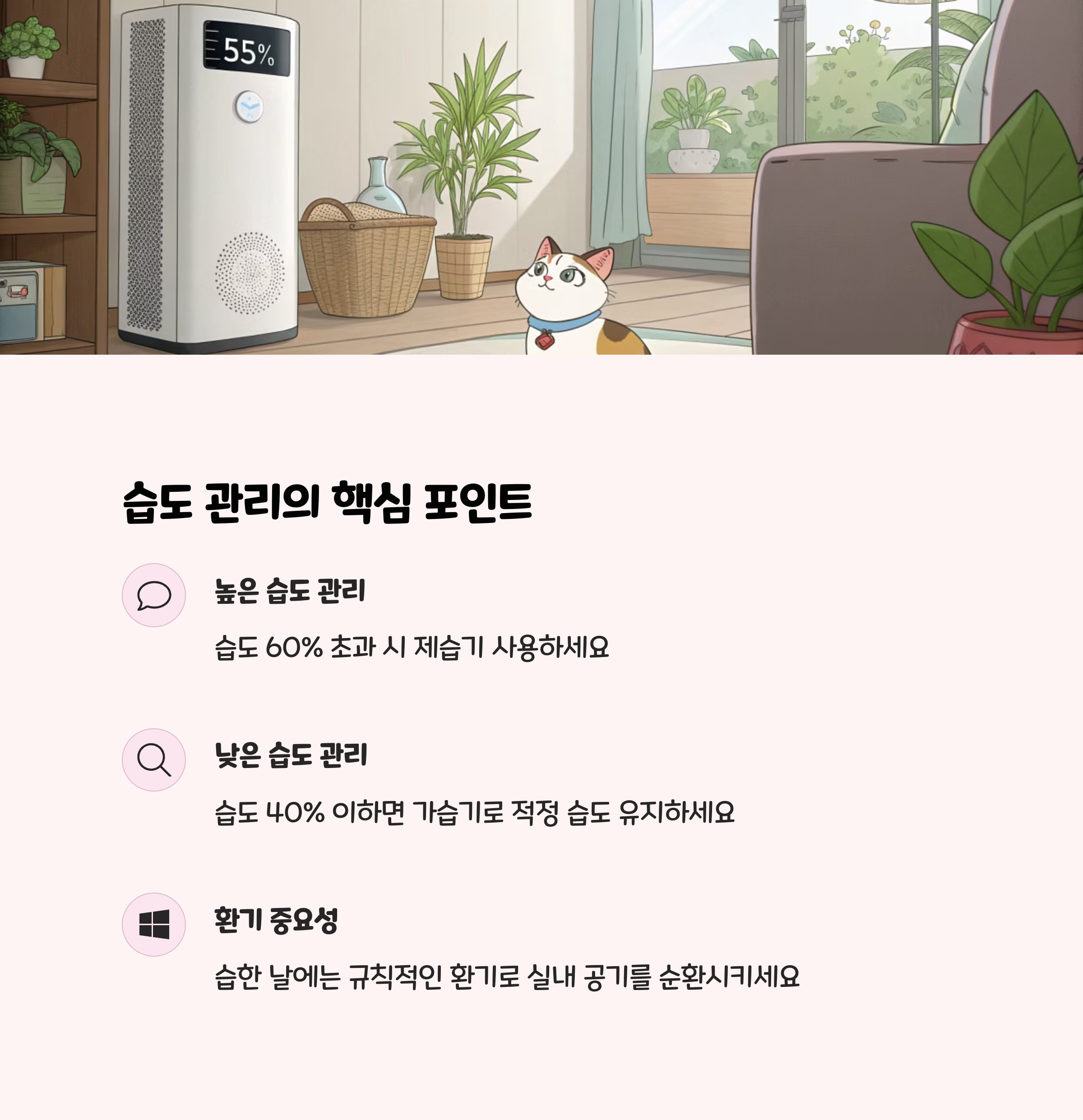 • 실내 습도가 높으면 제습기를 활용해 쾌적한 환경을 유지하세요.