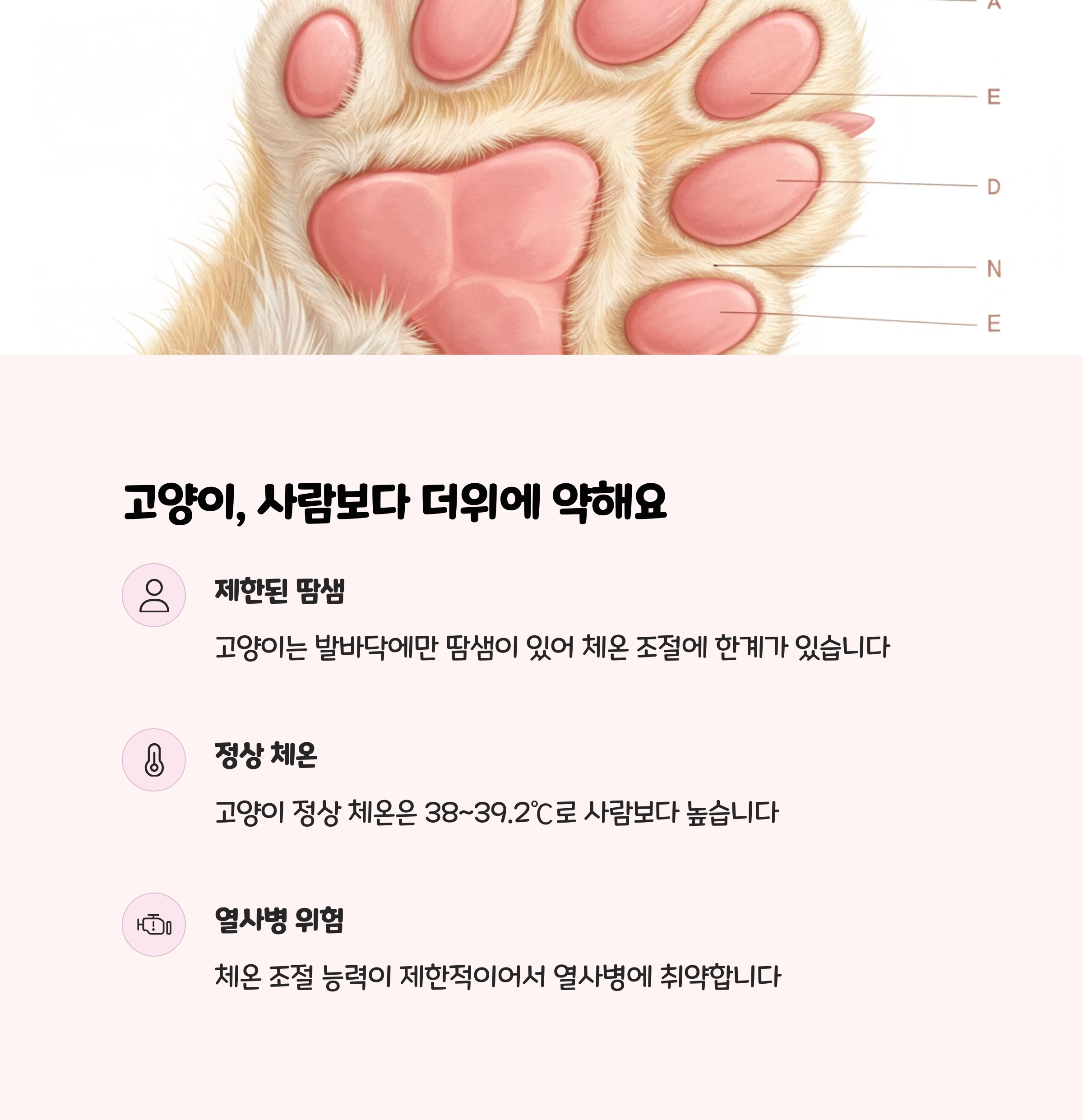 • 고양이가 좋아하는 자리에 쿨매트, 대리석, 얼린 아이스팩(수건에 감싸서) 등을 두면 스스로 체온을 조절할 수 있습니다.