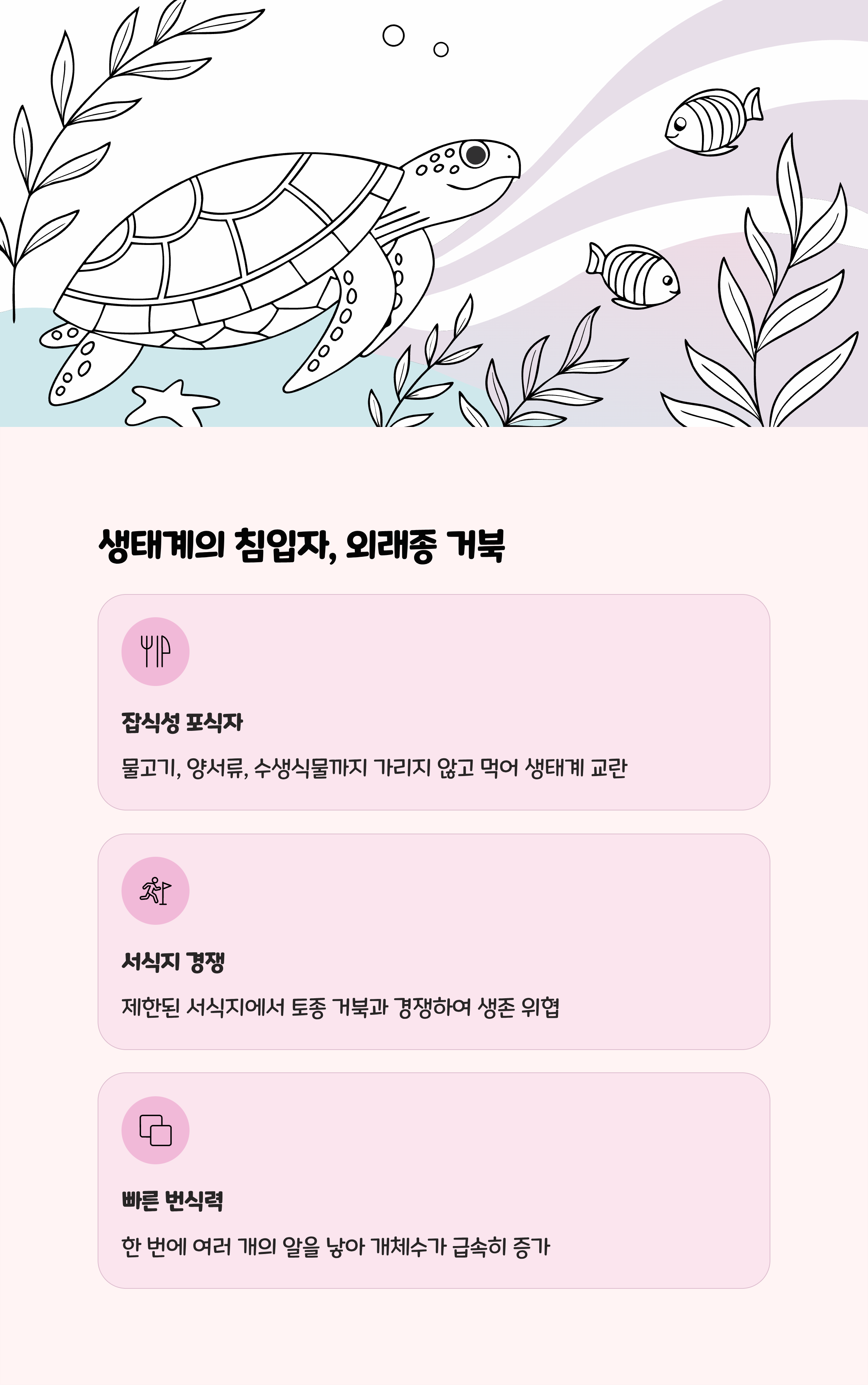 - 대부분 외래종 거북은 야생에서 천적이 없고 잡식성으로, 토종 거북류 및 수생 생물들과