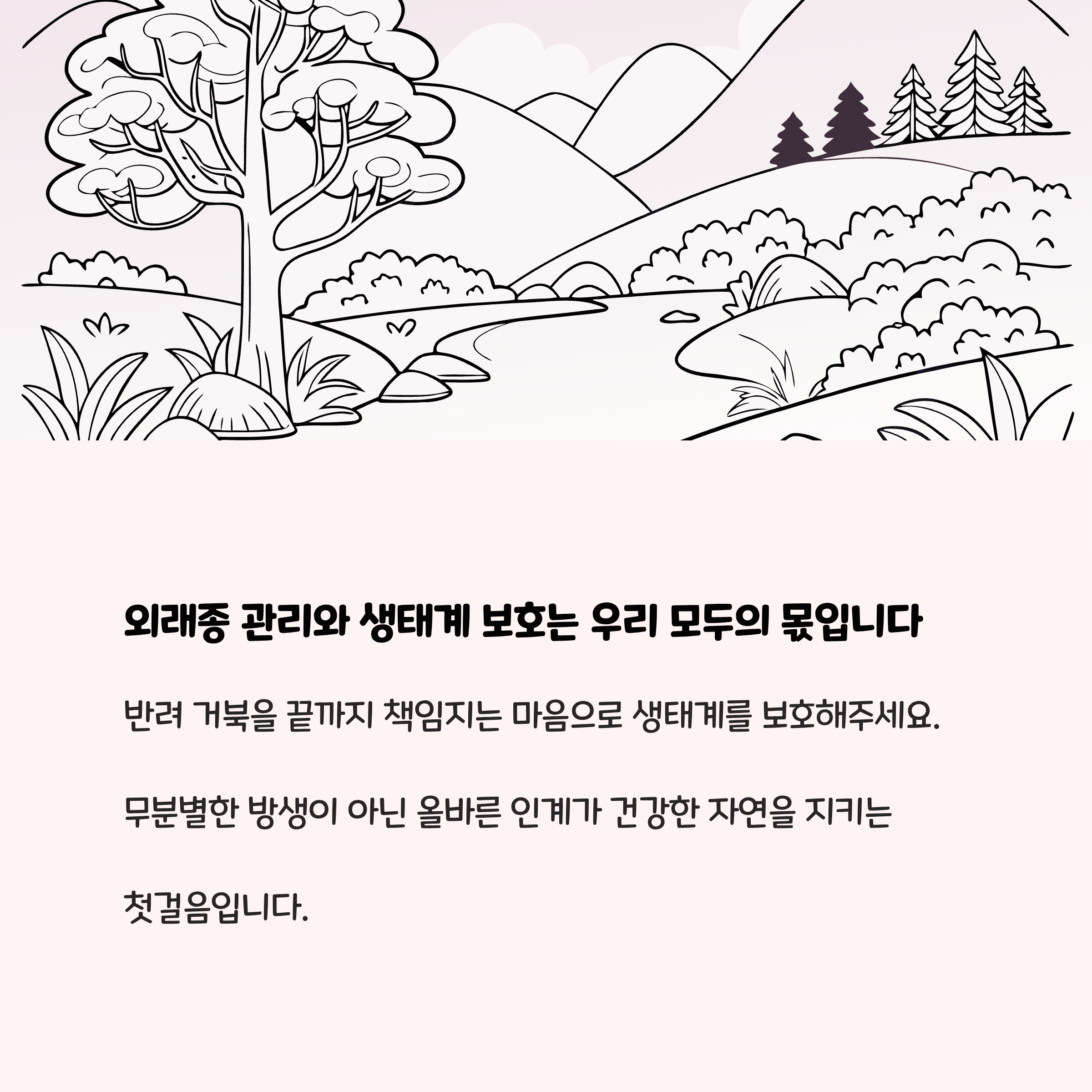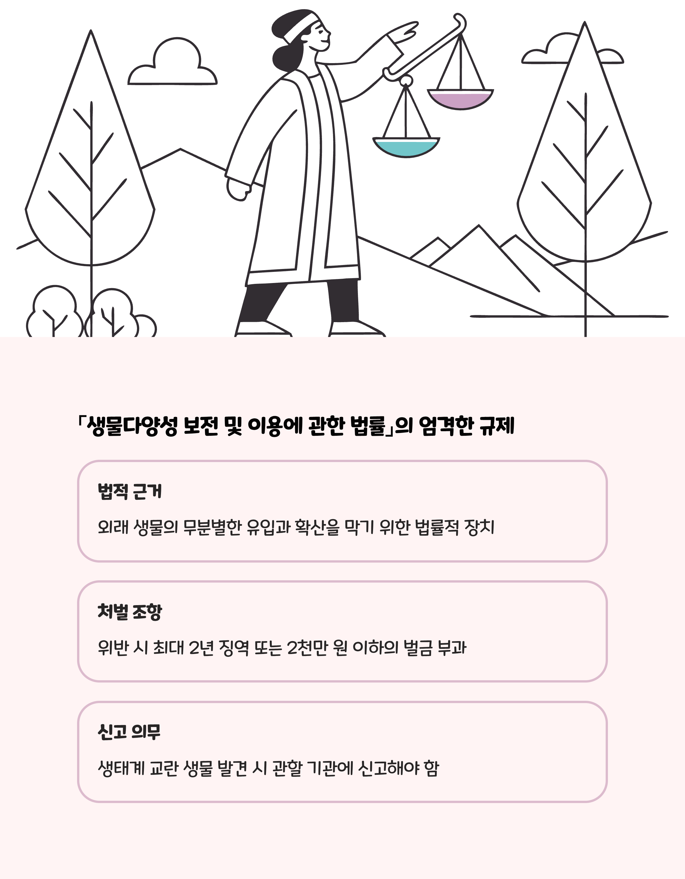 - 「생물다양성 보전 및 이용에 관한 법률」에 따라, 생태계교란 생물은 수입, 사육, 양도, 방사, 방생 등 모든 행위가 원칙적으로 금지되어 있습니다.