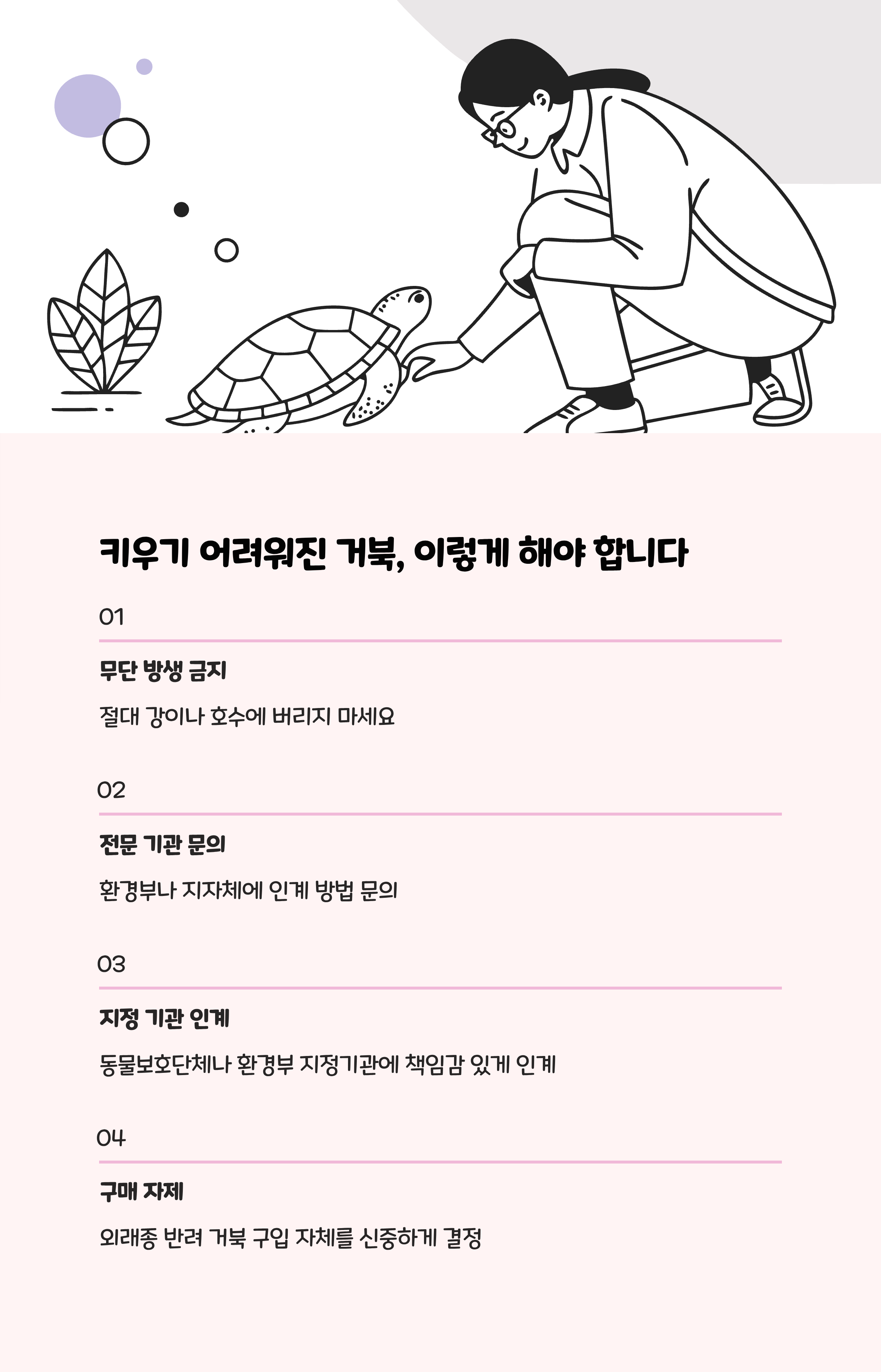 - 방생을 피하기 위해서는 크거나 더 이상 키우기 힘든 거북을 동물보호단체, 전문기관에 인계하는 등 책임 있는 조치가 필요합니다.