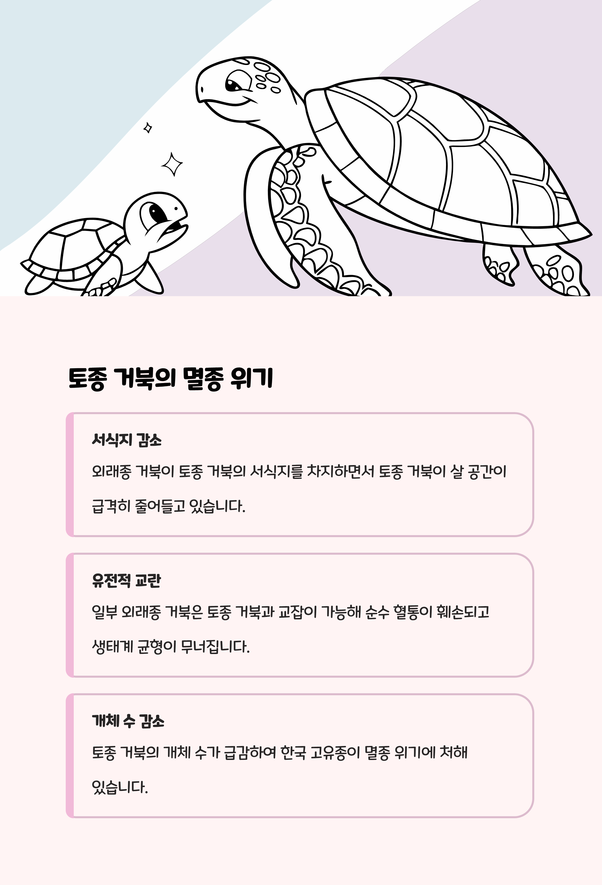 - 일부 외래종 거북(예: 중국줄무늬목거북)은 토종종과 교잡하여 유전자를 교란시키는 위험도 있습니다.