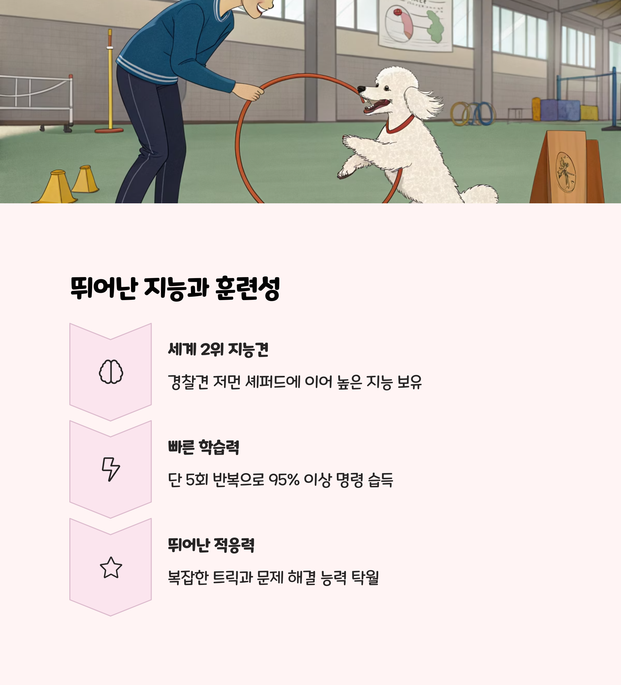 지능이 매우 높다: 푸들은 세계에서 두 번째로 똑똑한 견종으로 꼽힙니다. 기본적인 훈련은 물론, 다양한 명령어와 트릭도 짧은 시간에 습득할 수 있습니다.털이 거의 빠지지 않는다: 푸들의 곱슬거리는 털은 사람 머리카락처럼 잘 빠지지 않아, 집안에 털 날림 걱정이 적습니다. 알레르기 유발 가능성도 낮은 편이라 민감한 가족이 있는 집에도 잘 맞습니다.실내 배변 교육이 쉽다: 높은 지능 덕분에 실내 배변 훈련도 빠르게 익힙니다.온순하고 애교가 많다: 공격성이 낮고, 사람을 잘 따르며, 가족 구성원 모두와 친밀하게 지낼 수 있습니다.활동성이 적당하다: 산책과 놀이를 좋아하지만, 소형 푸들은 실내 생활에도 잘 적응합니다.