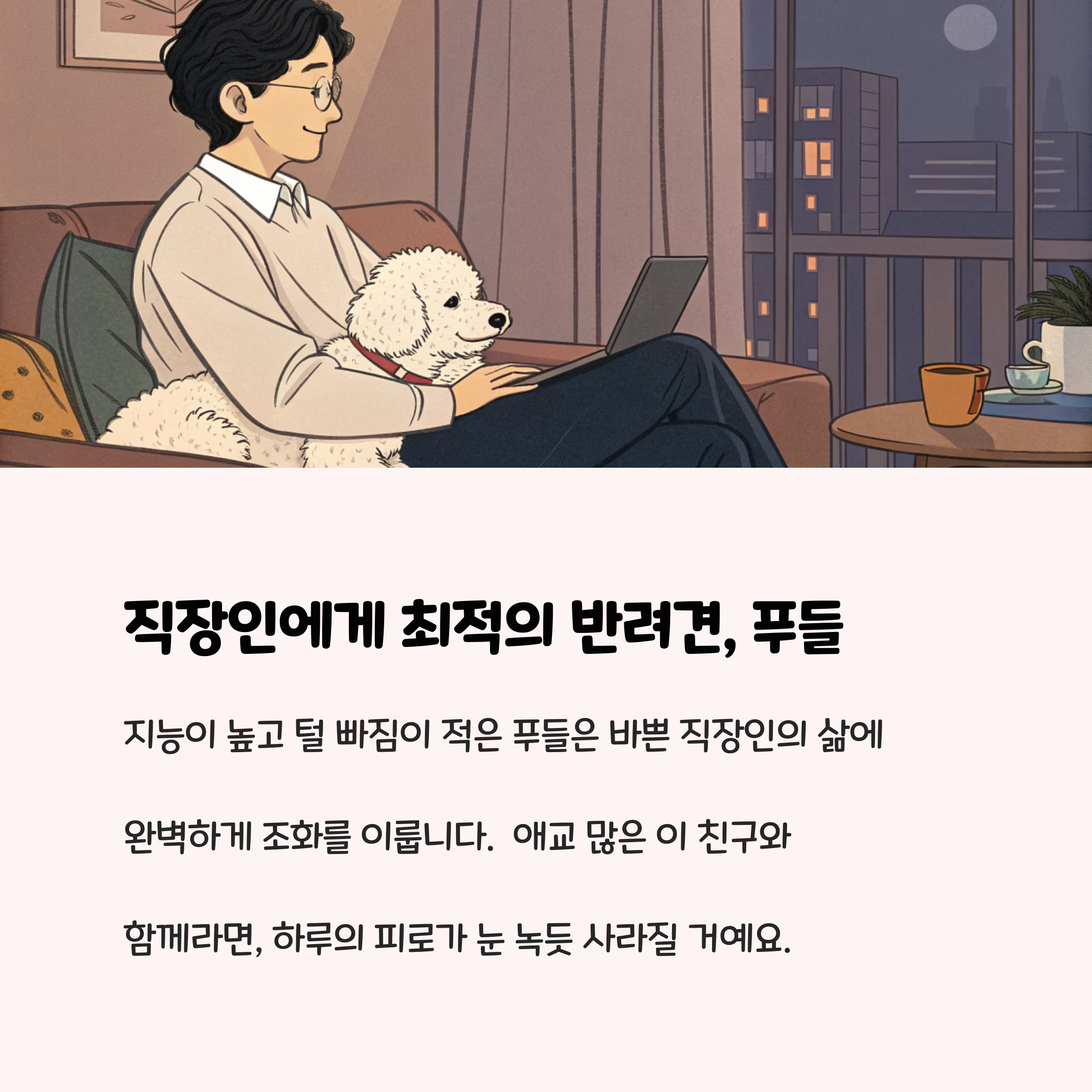 바쁜 직장 생활 속에서도 집에서 반려견과 함께하는 삶을 꿈꾸는 분들이 많습니다. 특히 아파트나 오피스텔 등 제한된 공간에서 키우기 좋은 소형견을 찾는다면, 푸들은 단연 많은 사랑을 받고 있는 견종입니다. 하지만 “정말 직장인에게 푸들이 잘 맞을까?”라는 고민이 드는 것도 사실입니다. 오늘은 푸들의 특성, 장점과 단점, 그리고 직장인에게 적합한 이유와 주의할 점까지 꼼꼼하게 알려드리겠습니다.