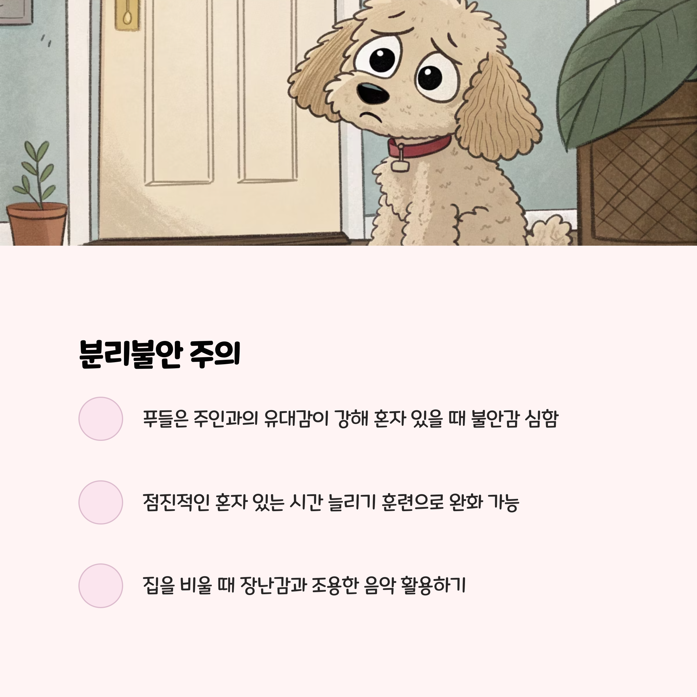 푸들은 주인에 대한 애착이 강해 혼자 있는 시간을 힘들어할 수 있습니다. 분리불안 예방을 위해 어릴 때부터 혼자 있는 훈련을 하거나, 다양한 장난감과 자동급식기, 반려동물 CCTV 등을 활용해 외로움을 줄여주는 것이 중요합니다.
