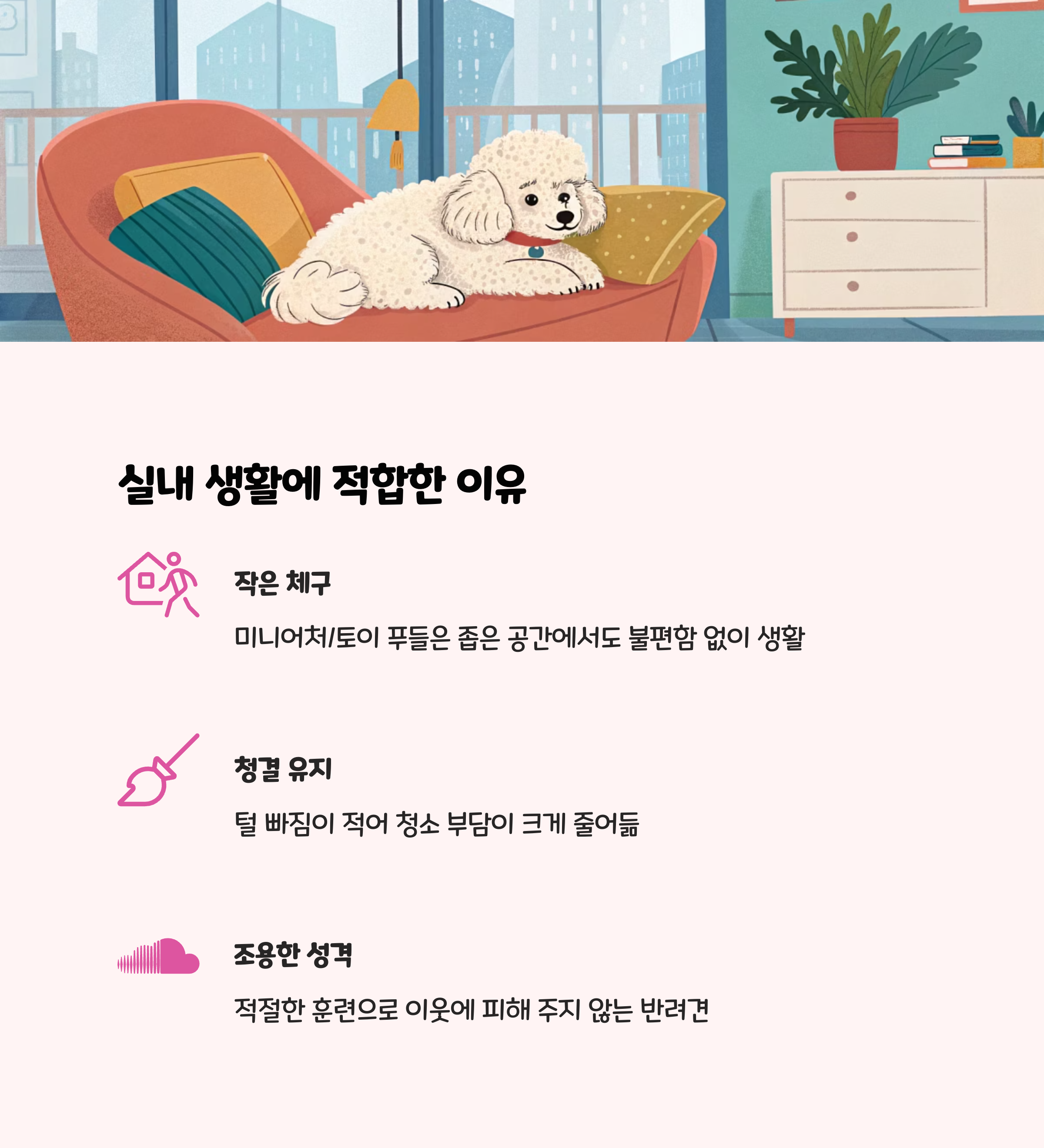 실내 생활에 최적화: 작은 체구와 적은 털 빠짐, 높은 지능 덕분에 아파트나 오피스텔에서도 부담 없이 키울 수 있습니다.적은 냄새와 청결 유지: 푸들은 체취가 거의 없고, 털 관리만 잘해주면 집안 환경도 쾌적하게 유지됩니다.짧은 훈련 시간: 바쁜 직장인도 짧은 시간 투자로 기본 훈련을 마칠 수 있습니다.