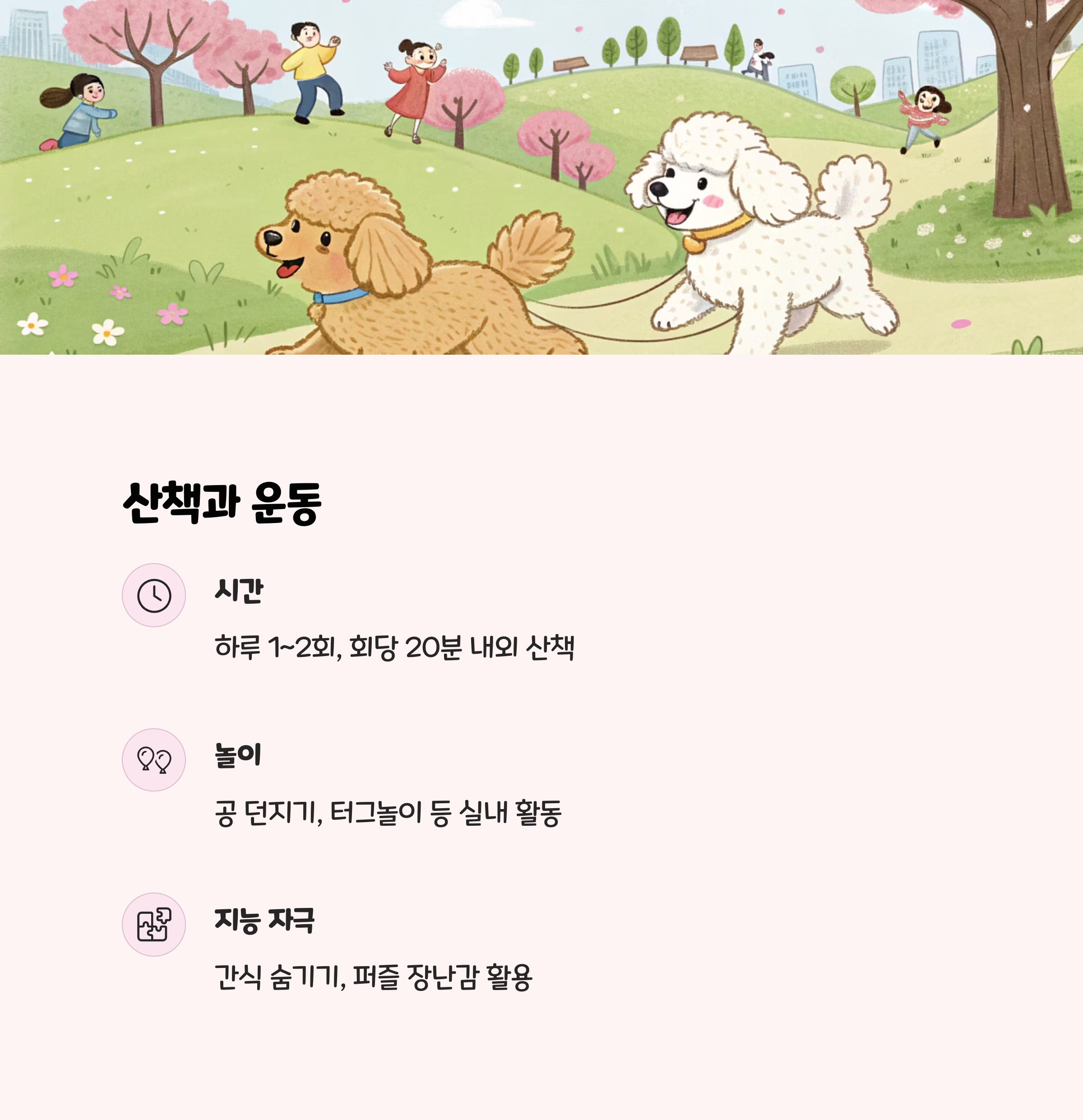 - 하루 1~2회, 20분 내외의 산책만으로도 충분한 에너지를 소모할 수 있습니다.