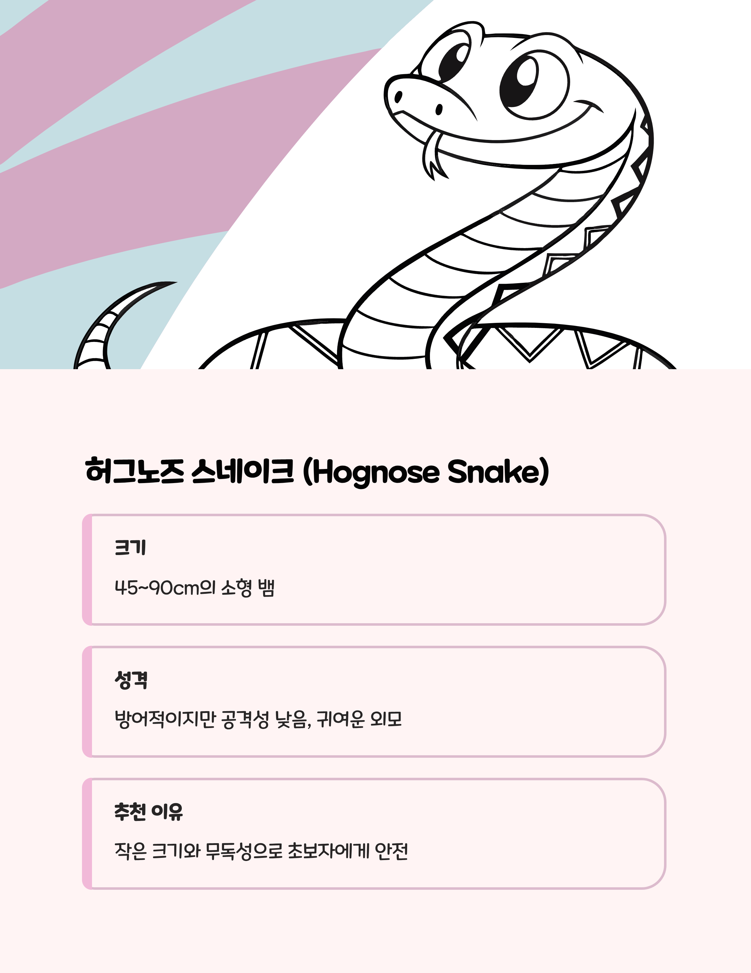| 허그노즈 스네이크 | 50~70 | 온순, 작고 귀여움 | ★★★★☆ |