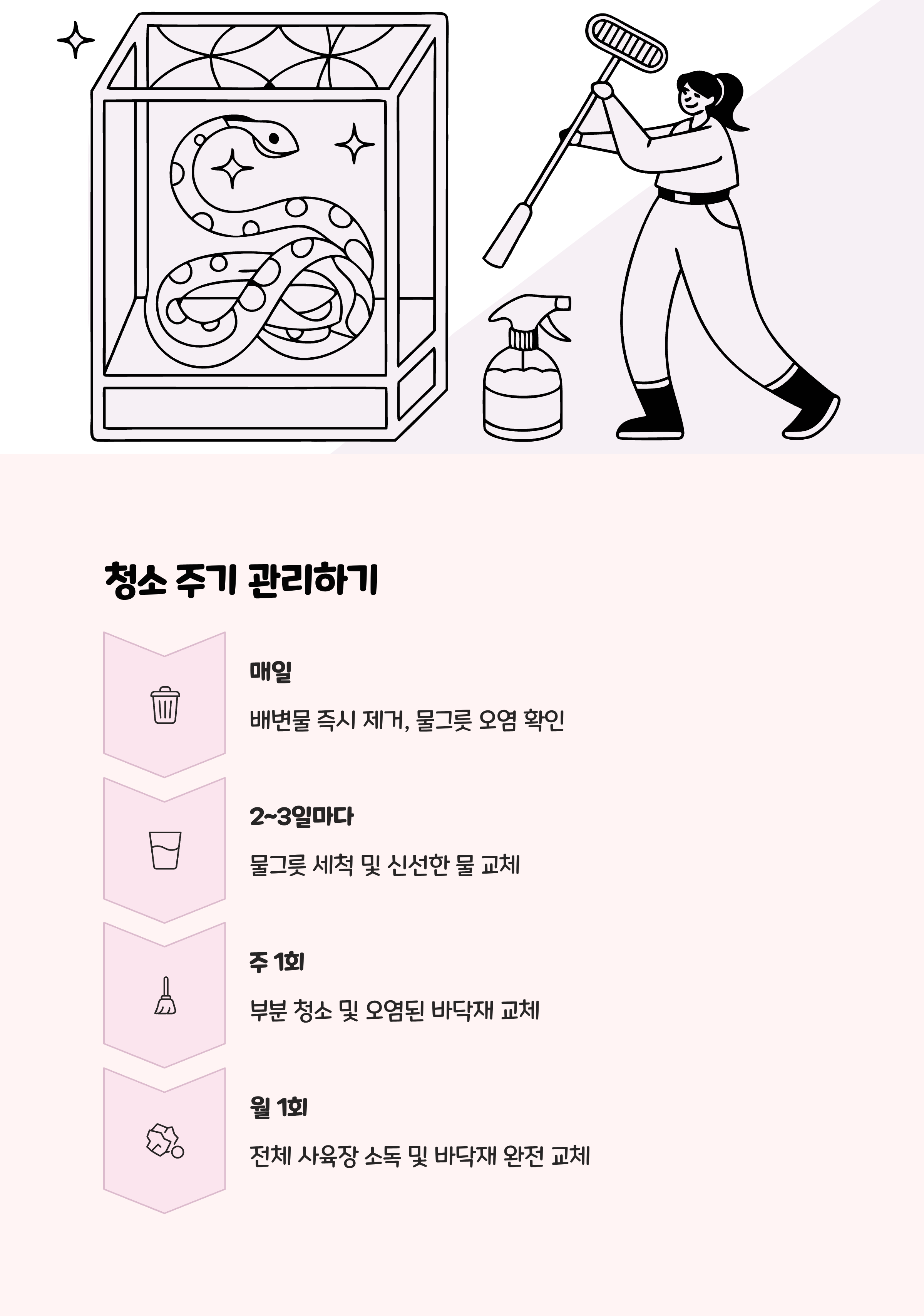 주 1회 이상 사육장을 깨끗이 청소하고, 먹이 찌꺼기, 배설물 등을 바로 치워야 합니다. 반려 뱀의 건강 이상 징후(식욕 저하, 피부 문제, 이상 행동 등)를 주의 깊게 관찰하고 필요시 전문가와 상담해야 합니다.