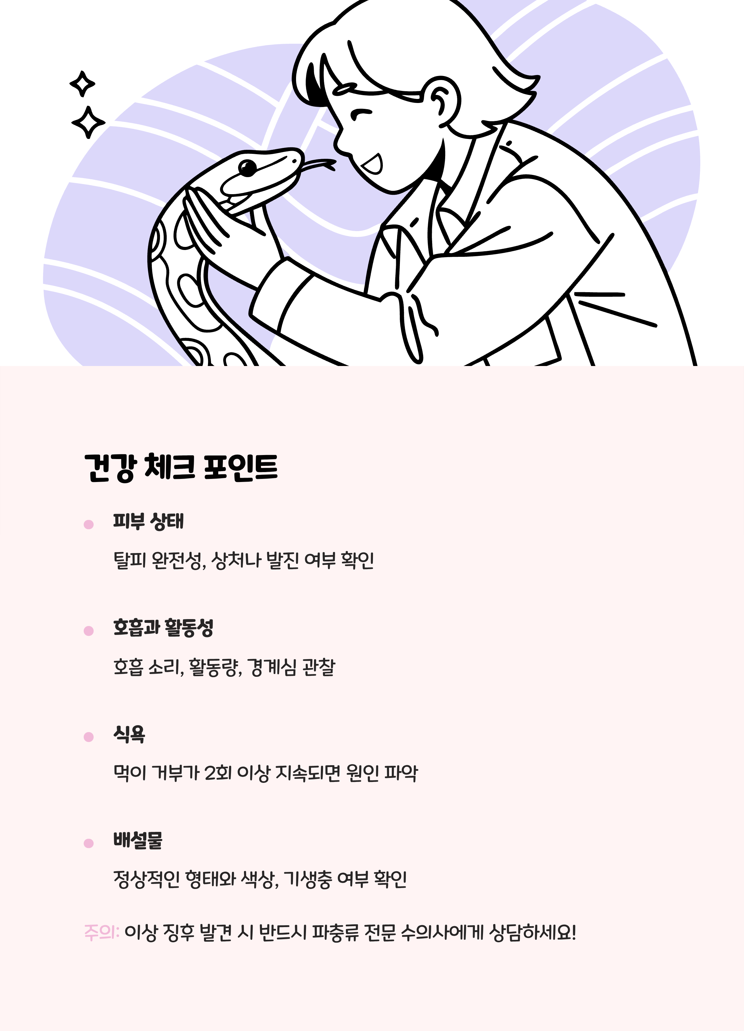 처음 입문할 때는 작은 크기의 온순한 종류를 선택하고, 환경과 건강 관리를 꼼꼼히 하는 습관을 들여 스트레스 없는 반려 생활을 누리세요. 이렇게 뱀과의 신뢰와 유대감을 쌓아가면 뜻밖의 즐거움과 특별한 경험을 하실 수 있을 것입니다.