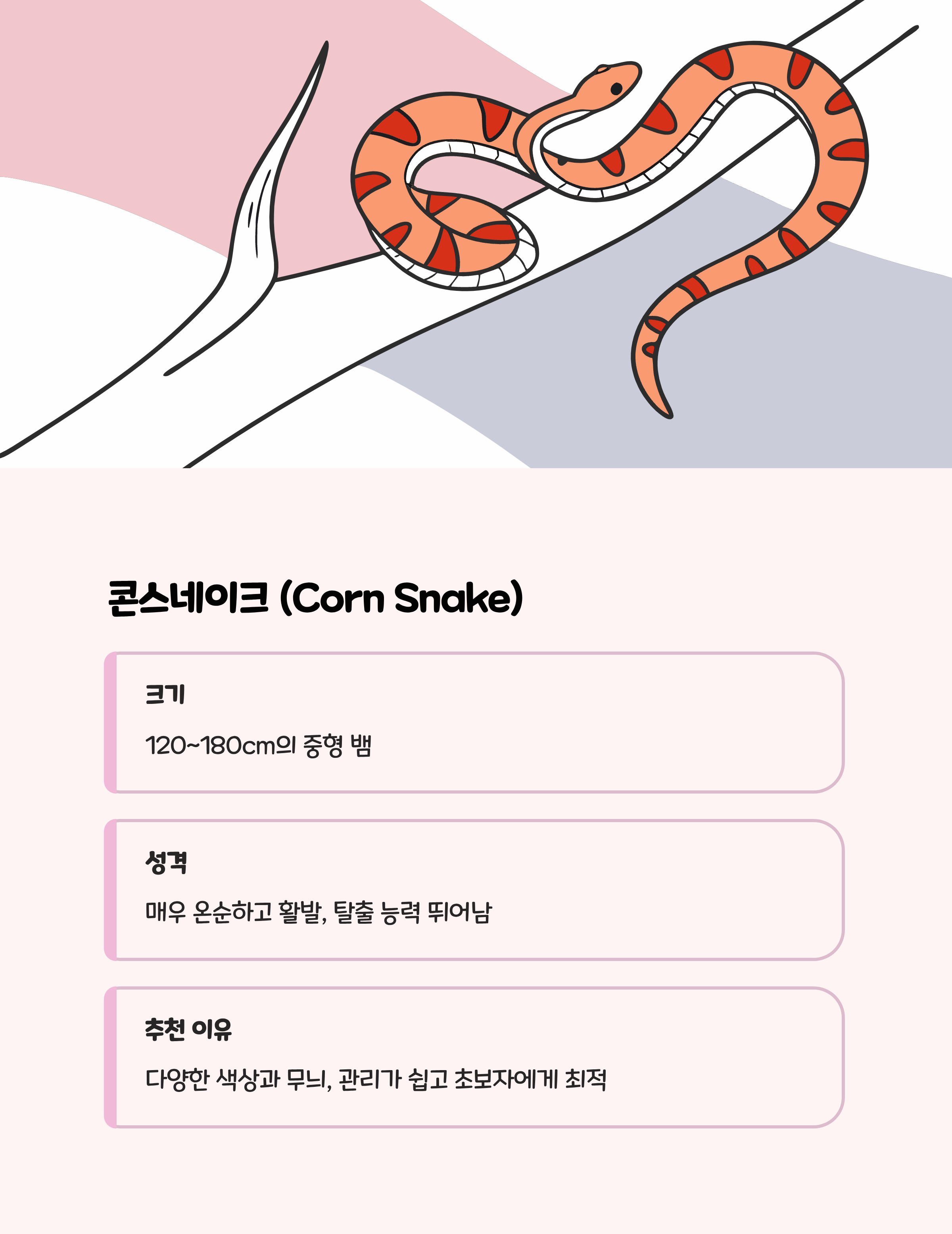 | 콘스네이크 | 90~180 | 활발, 친화적, 스트레스 강함 | ★★★★☆ |