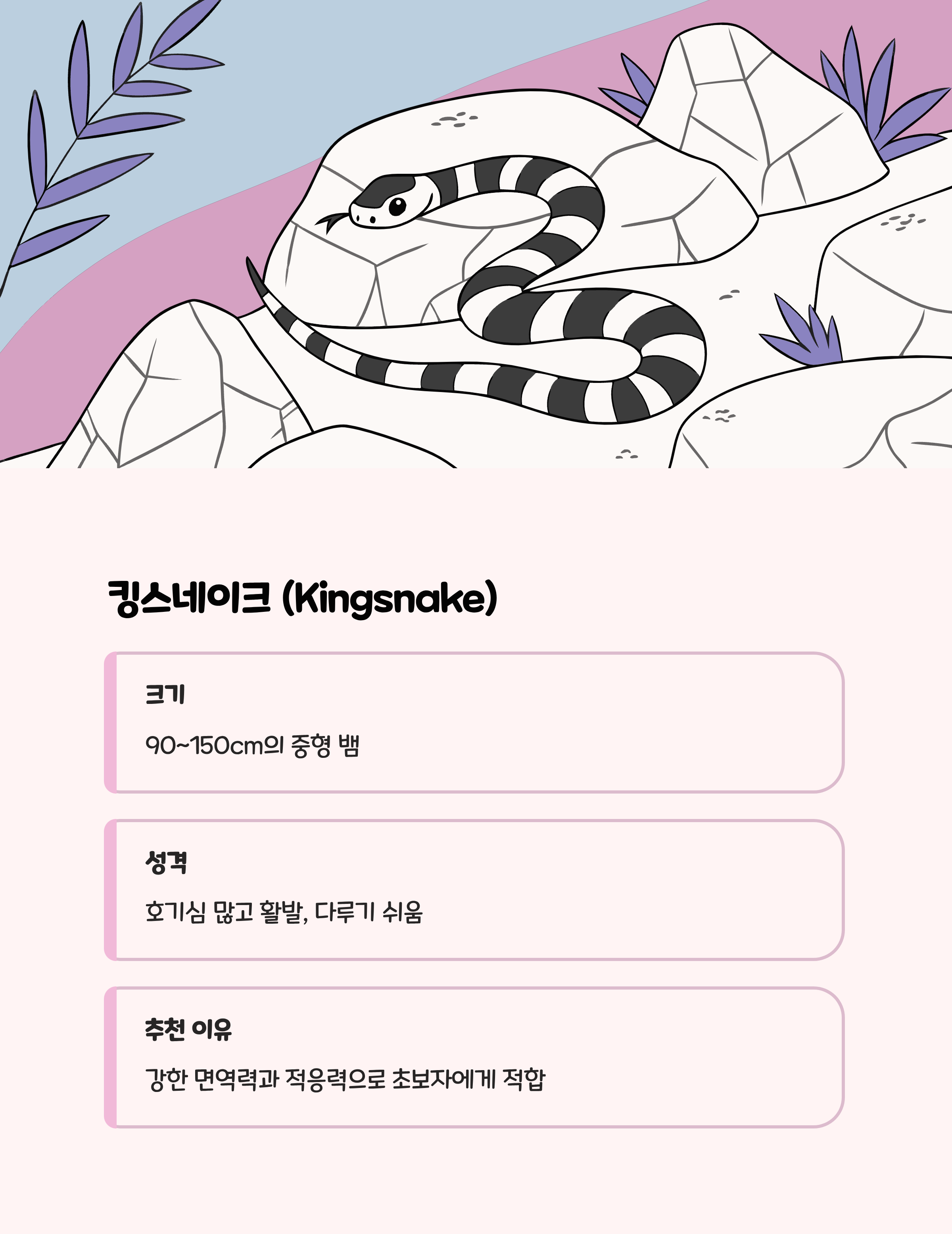 | 킹스네이크 | 90~150 | 호기심 많음, 활발, 면역력 강함 | ★★★☆☆ |