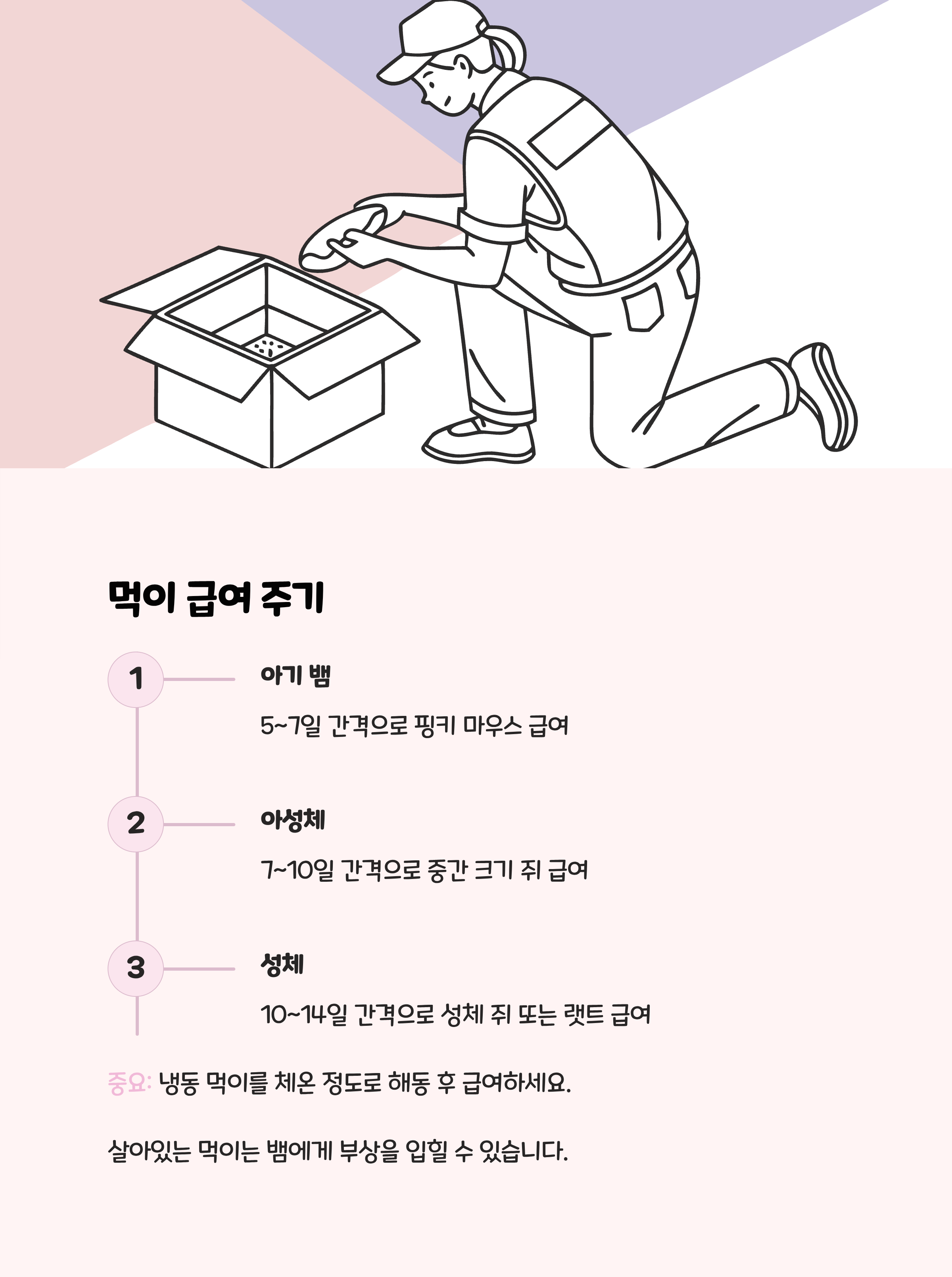 아기 뱀부터 성체까지 먹이 크기를 알맞게 조절해야 하며, 주로 생쥐나 작은 설치류를 급여합니다. 아기뱀은 4~5일 간격, 성체는 7~10일 간격으로 급여하는 것이 좋고, 냉동 먹이를 위생적으로 해동 후 주는 것이 중요합니다.