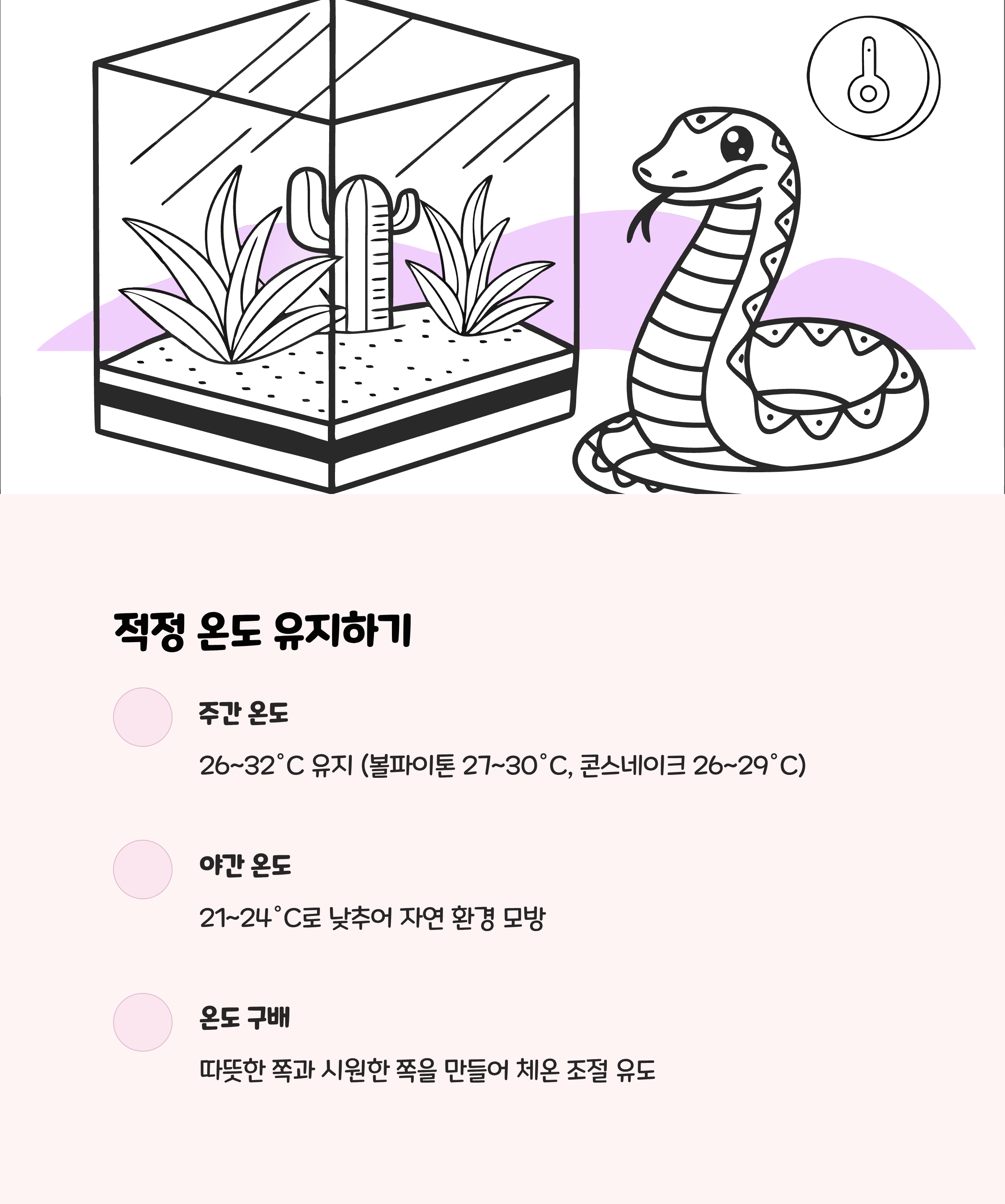 일반적으로 볼파이톤은 주간 30도 내외, 야간 24~26도 유지가 적합하며, 콘스네이크와 킹스네이크도 비슷한 온도 조건을 선호합니다. 습도는 40~60% 범위에서 유지하며, 탈피가 원활하도록 돕습니다.
