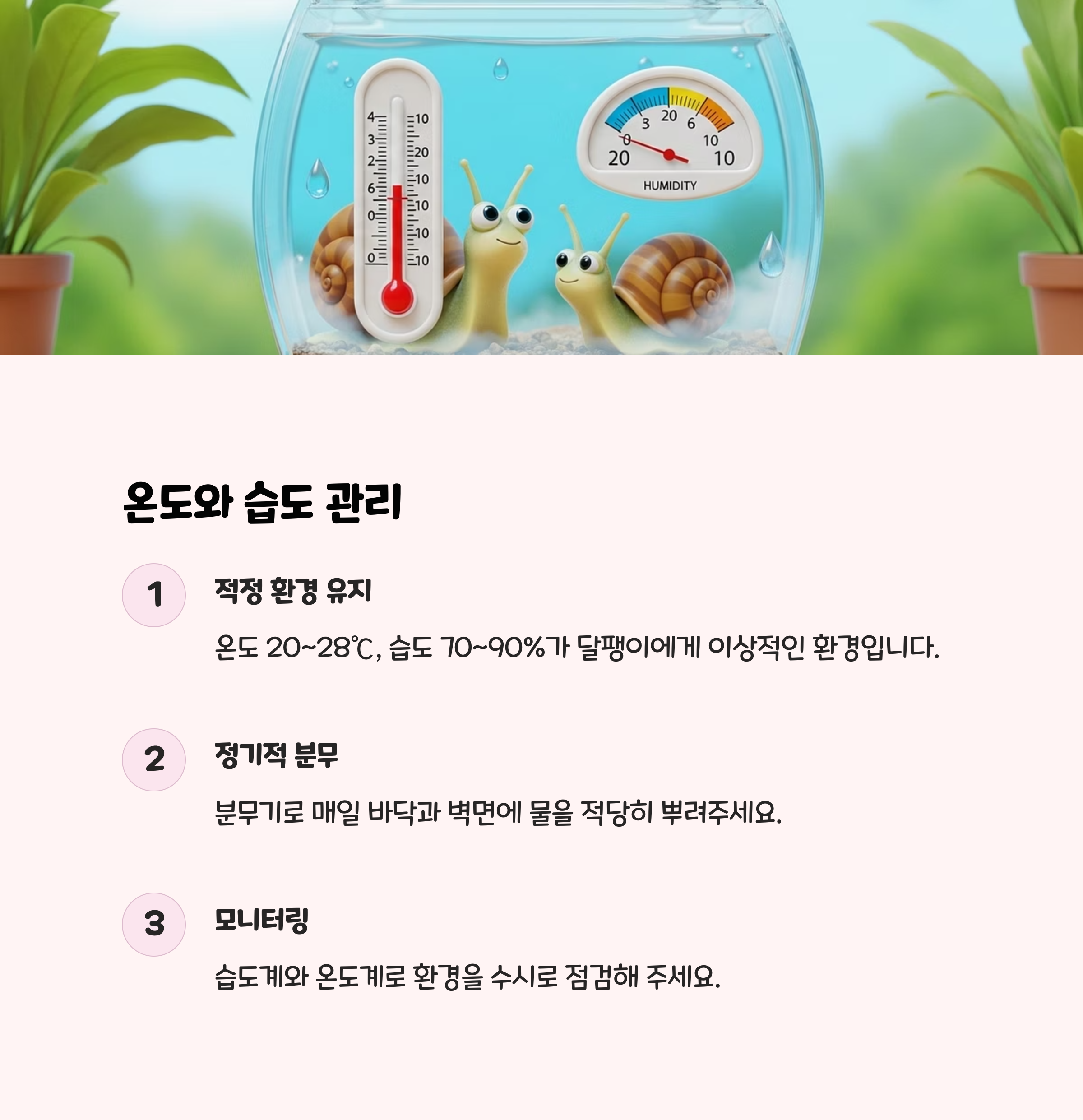 온도: 20~25℃, 아프리카 왕달팽이는 20~28℃습도: 70~90% 유지, 분무기로 수분 공급환기: 뚜껑에 환기구 필수, 탈출 방지.