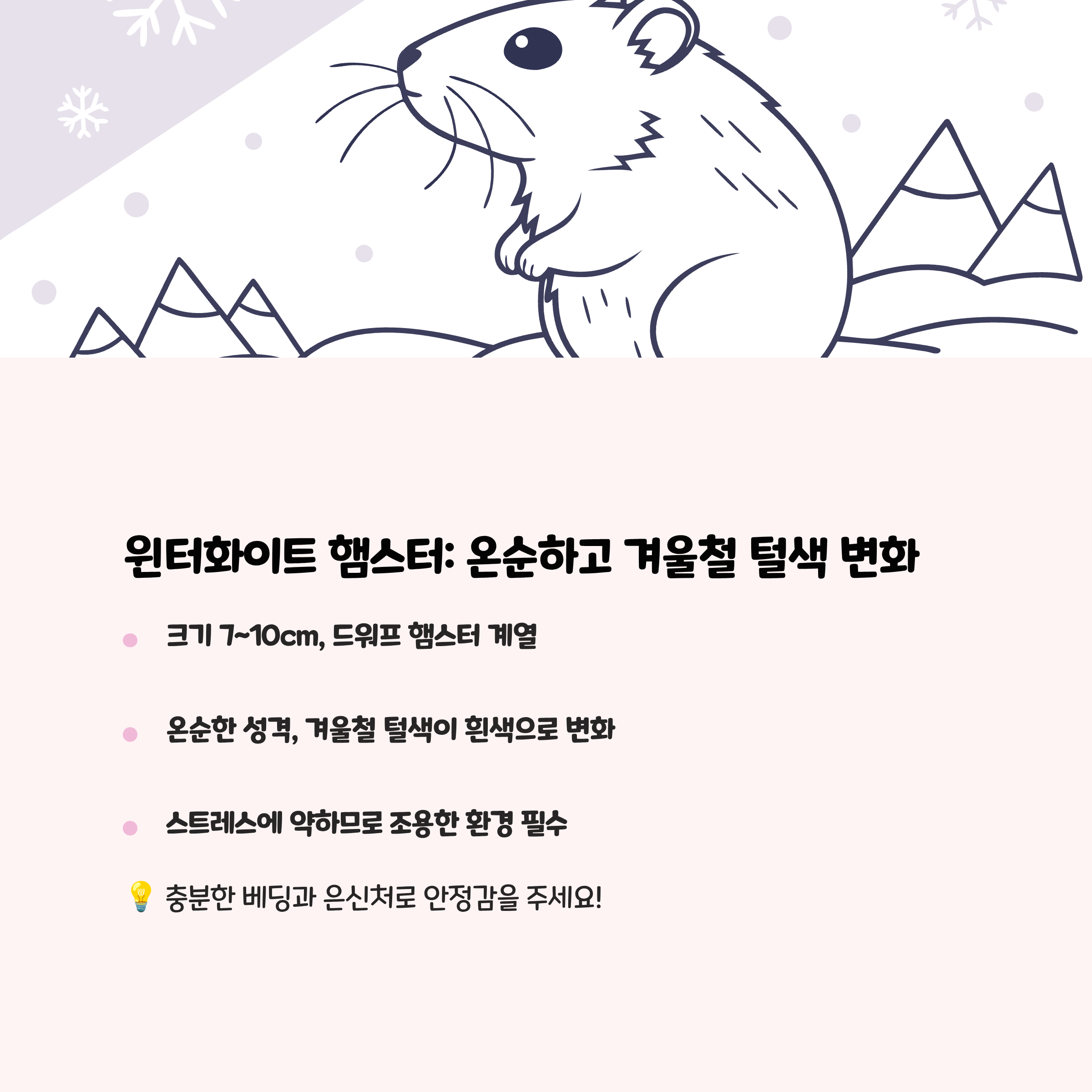 | 윈터 화이트 드워프 햄스터 | 온순하고 사교적 | 깊은 베딩, 은신처, 운동 공간 확보 |