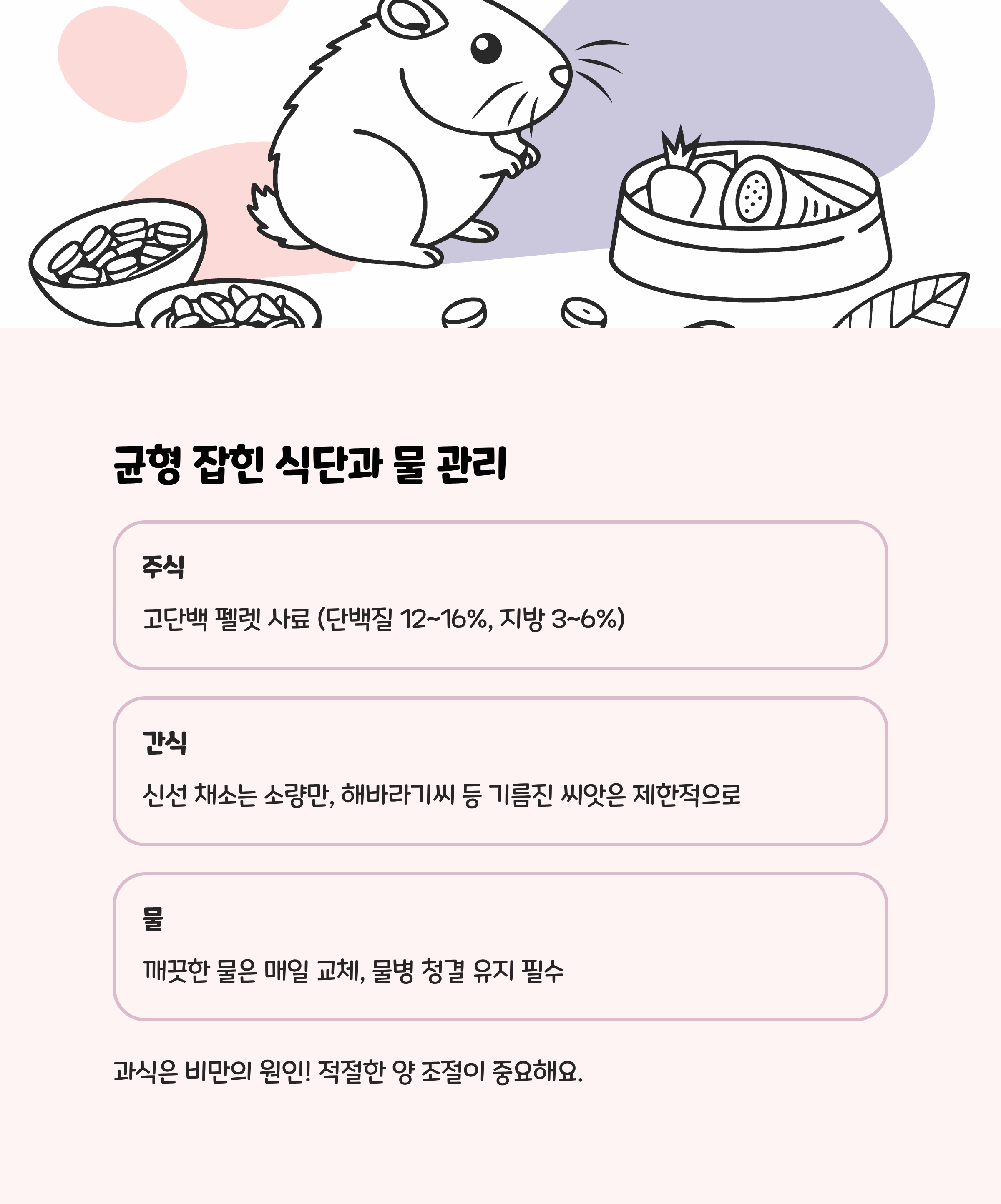 | 차이니즈 햄스터 | 활발하고 호기심 많음 | 등반과 도약 좋아함, 높은 케이지 필요 |
