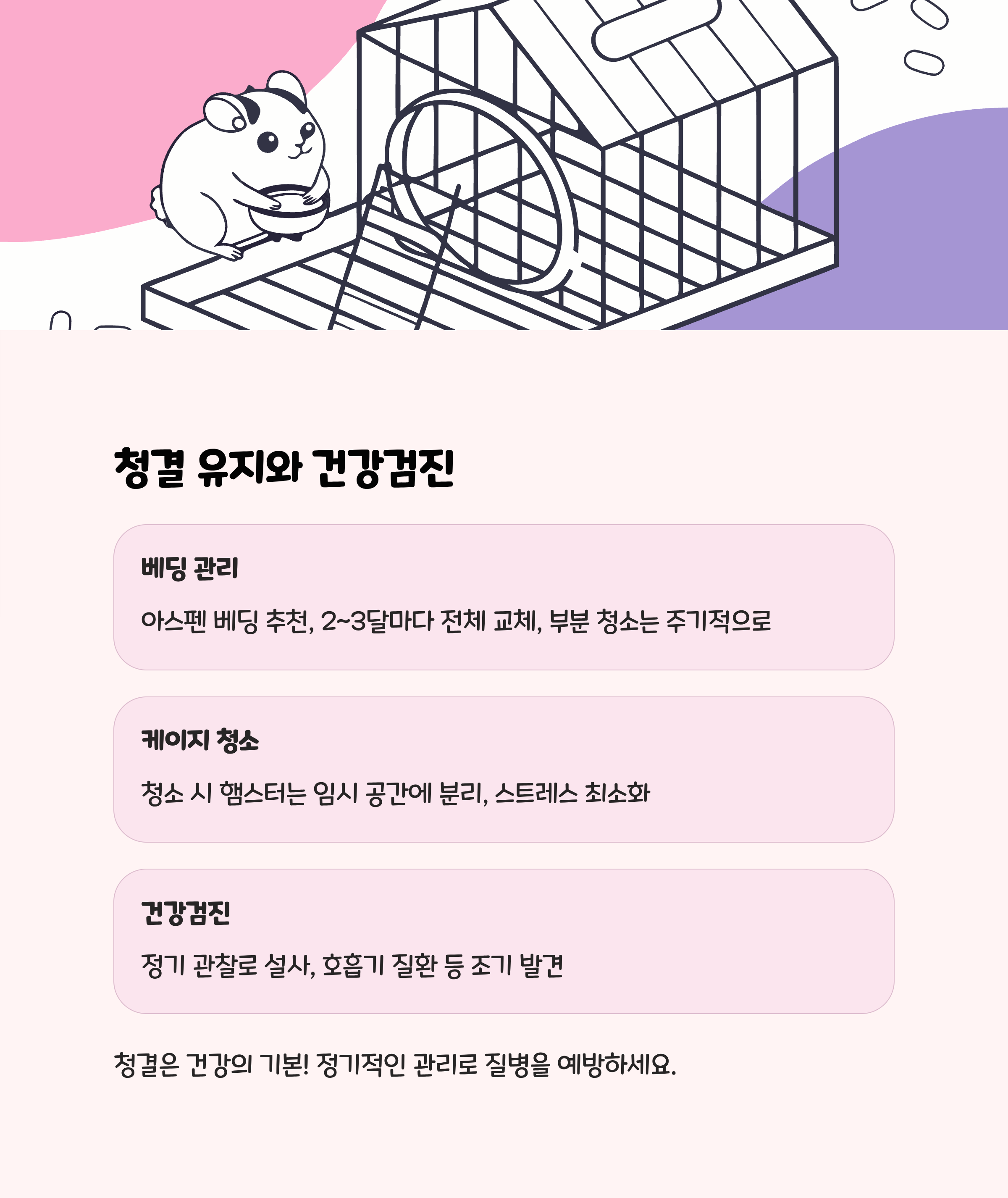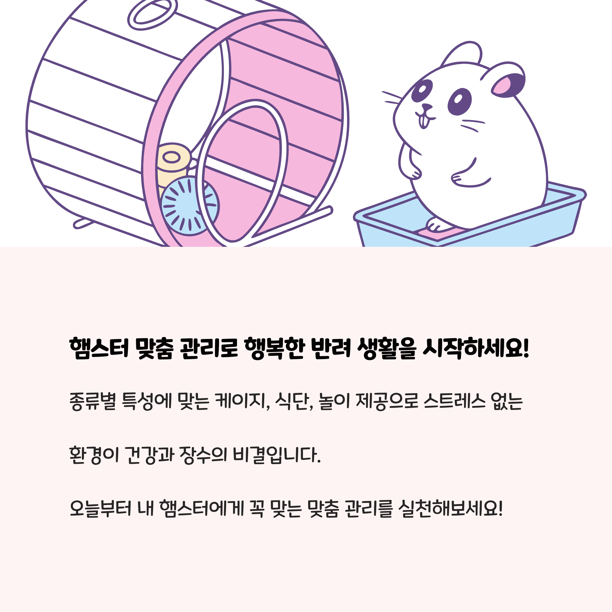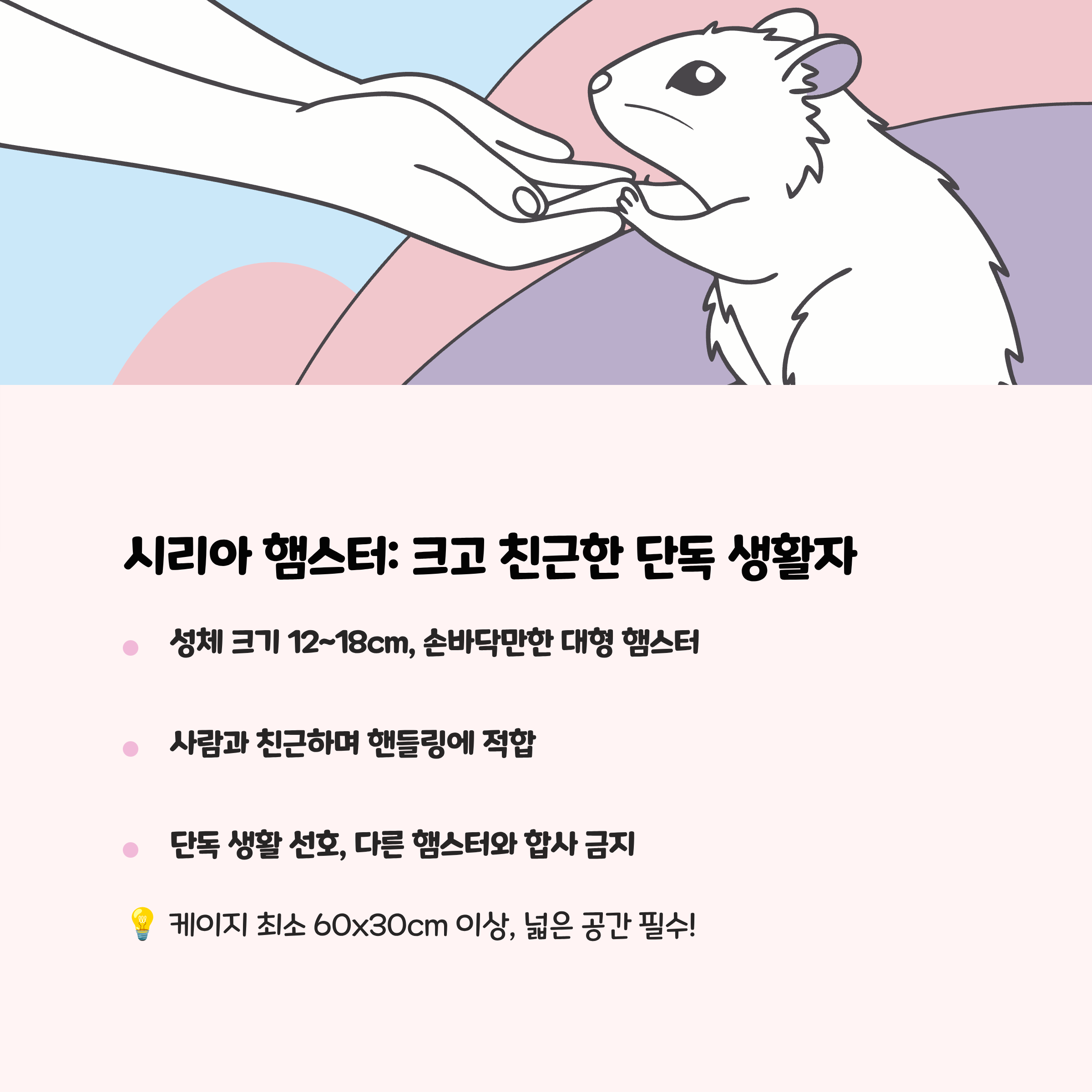 | 시리아 햄스터 | 친근하고 호기심 많음 | 혼자 생활, 넓은 케이지 필수 |