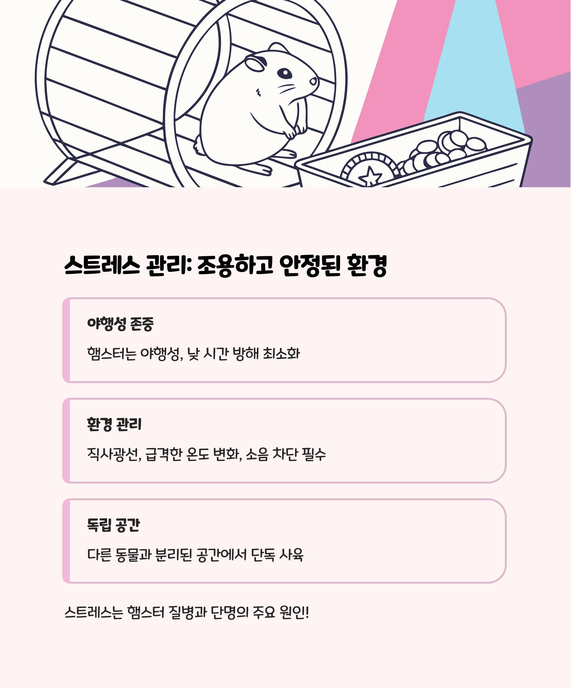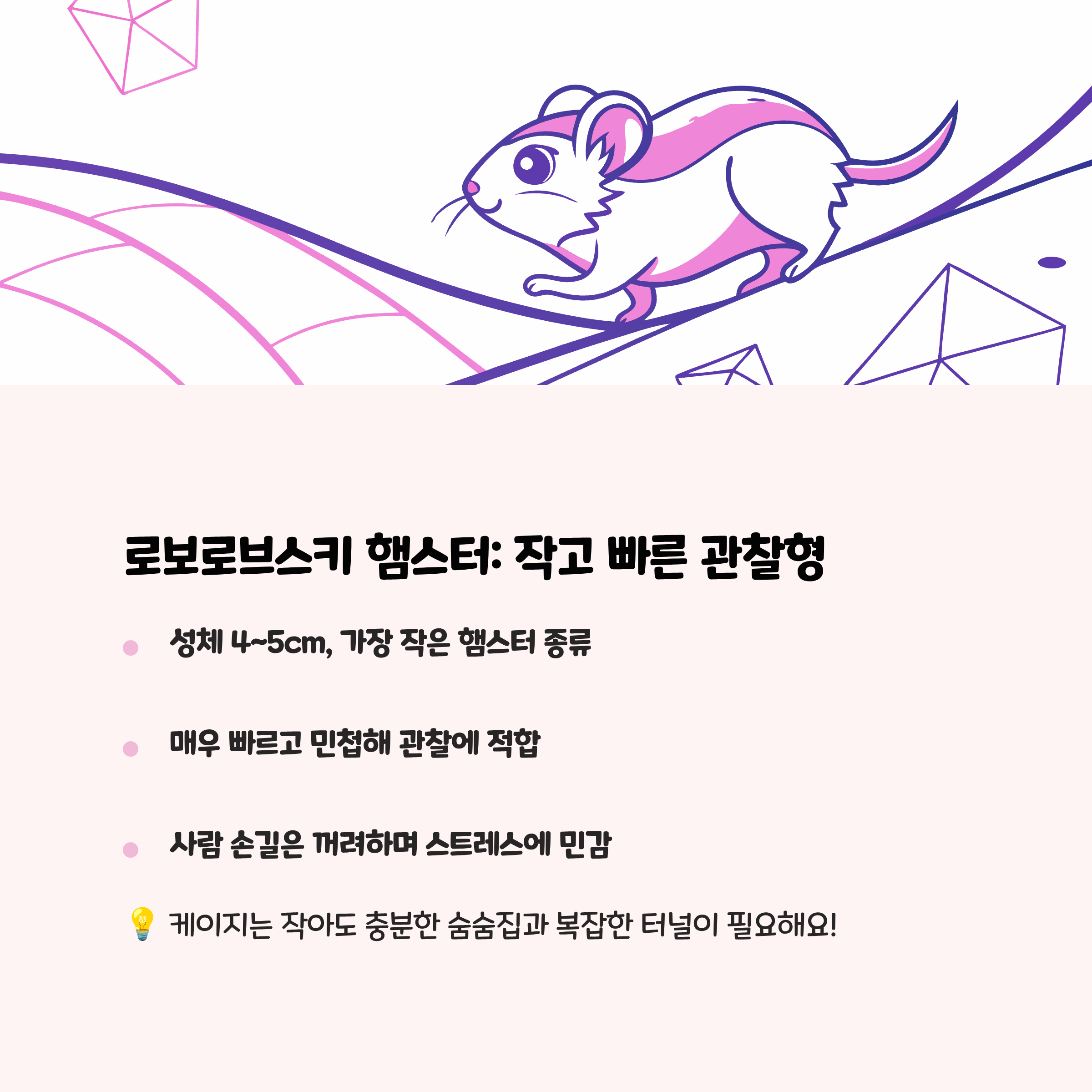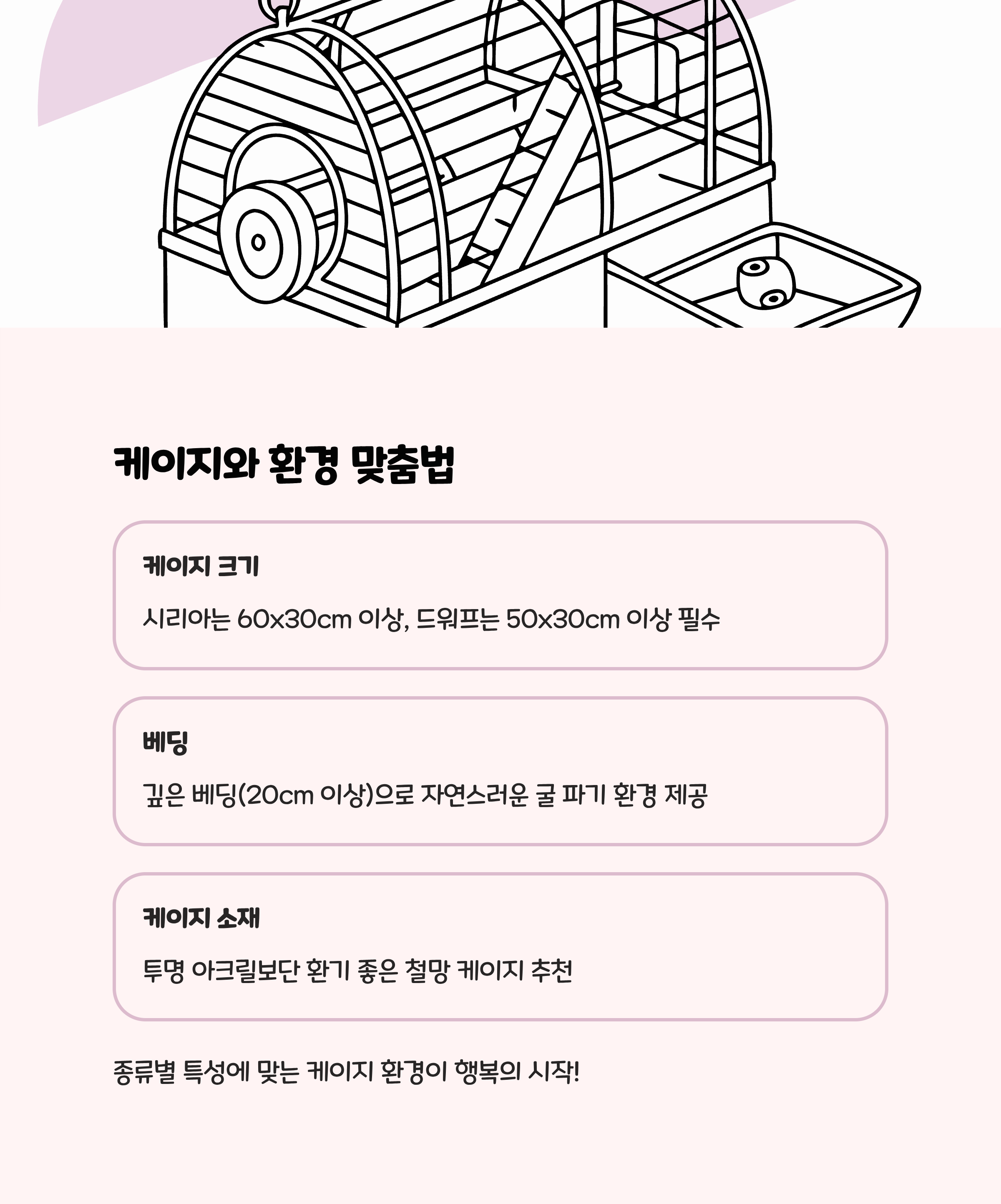 | 로보로브스키 햄스터 | 소심하고 빠름 | 탈출 방지 강화, 깊은 깔개 제공 |