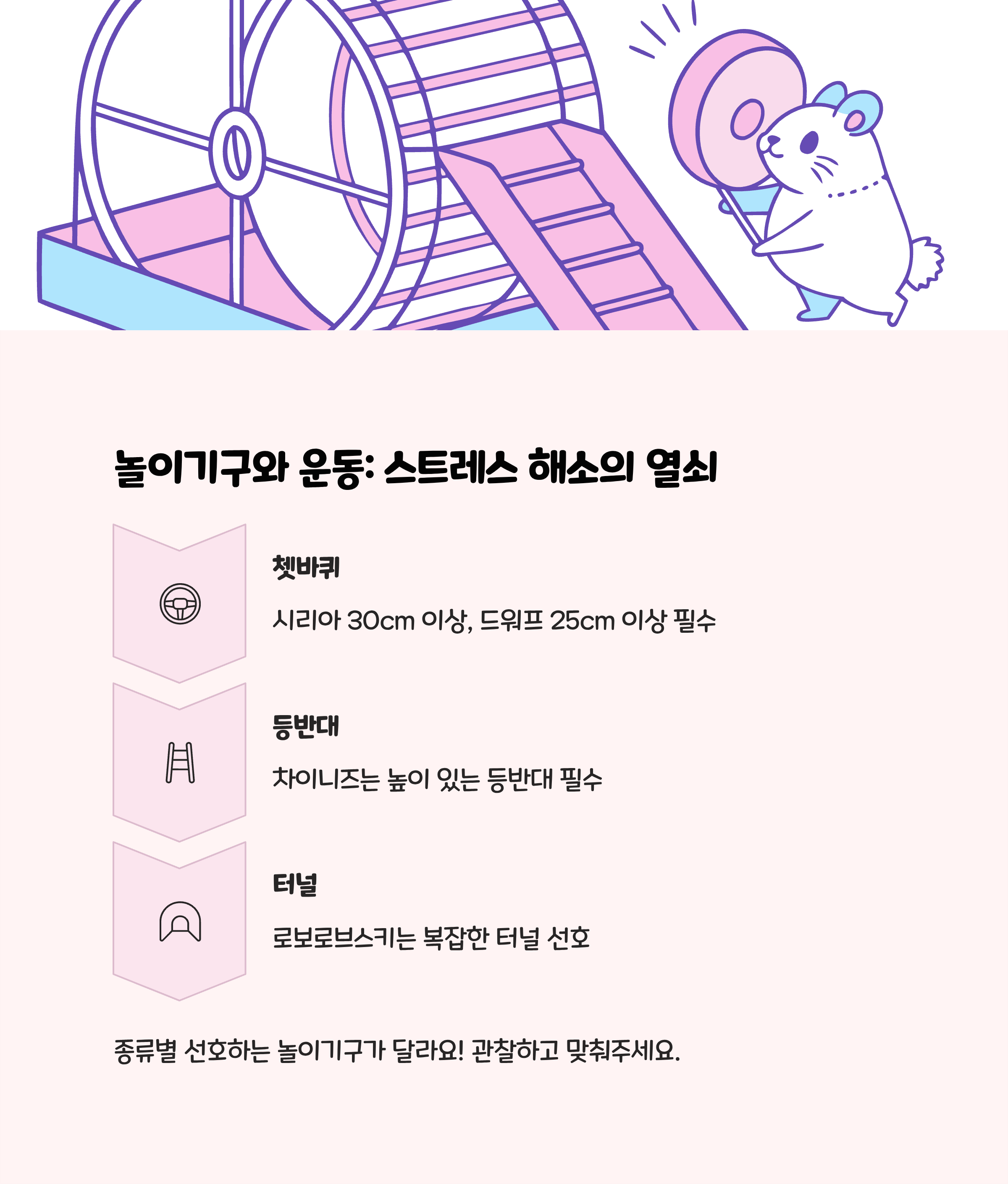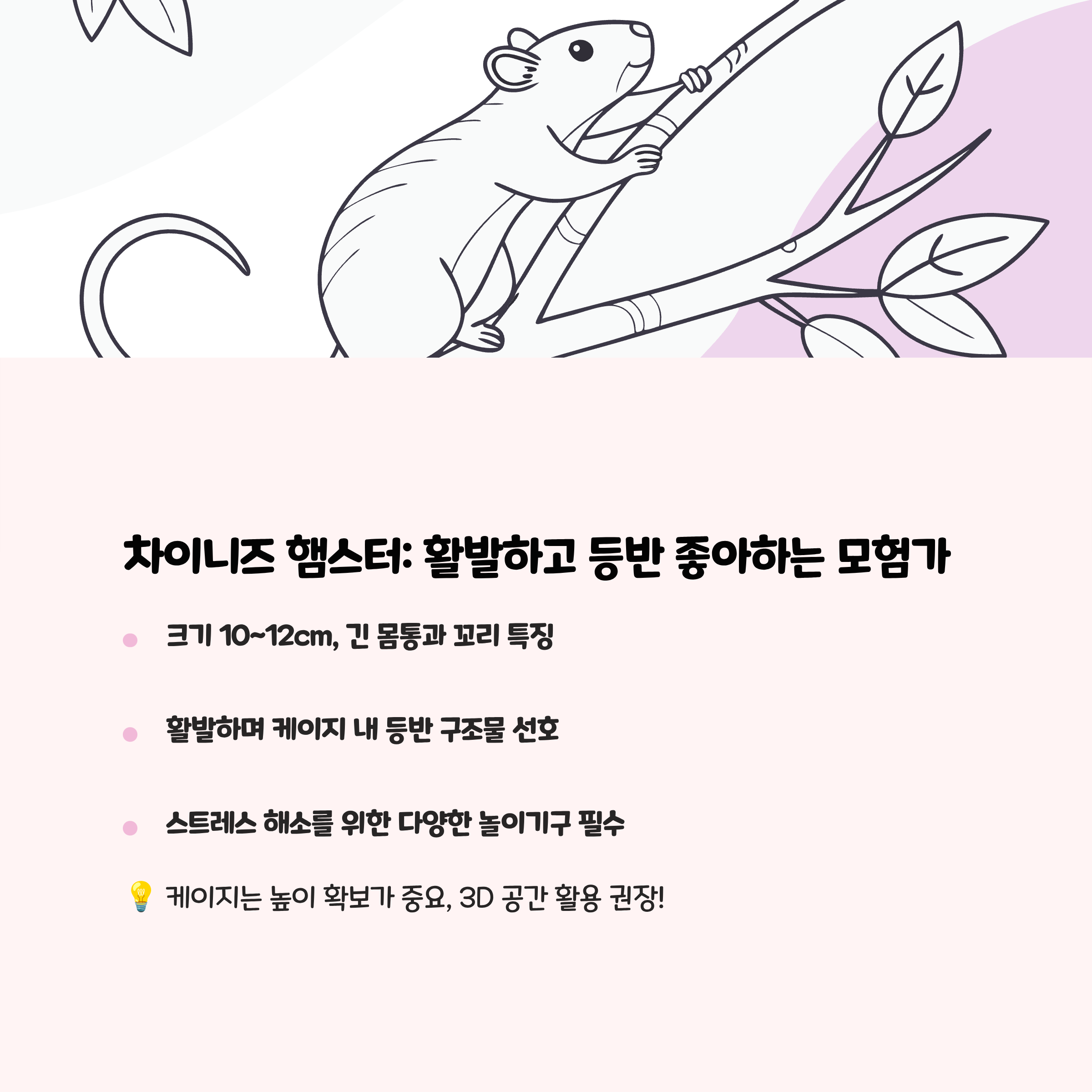 | 차이니즈 햄스터 | 활발하고 호기심 많음 | 등반과 도약 좋아함, 높은 케이지 필요 |