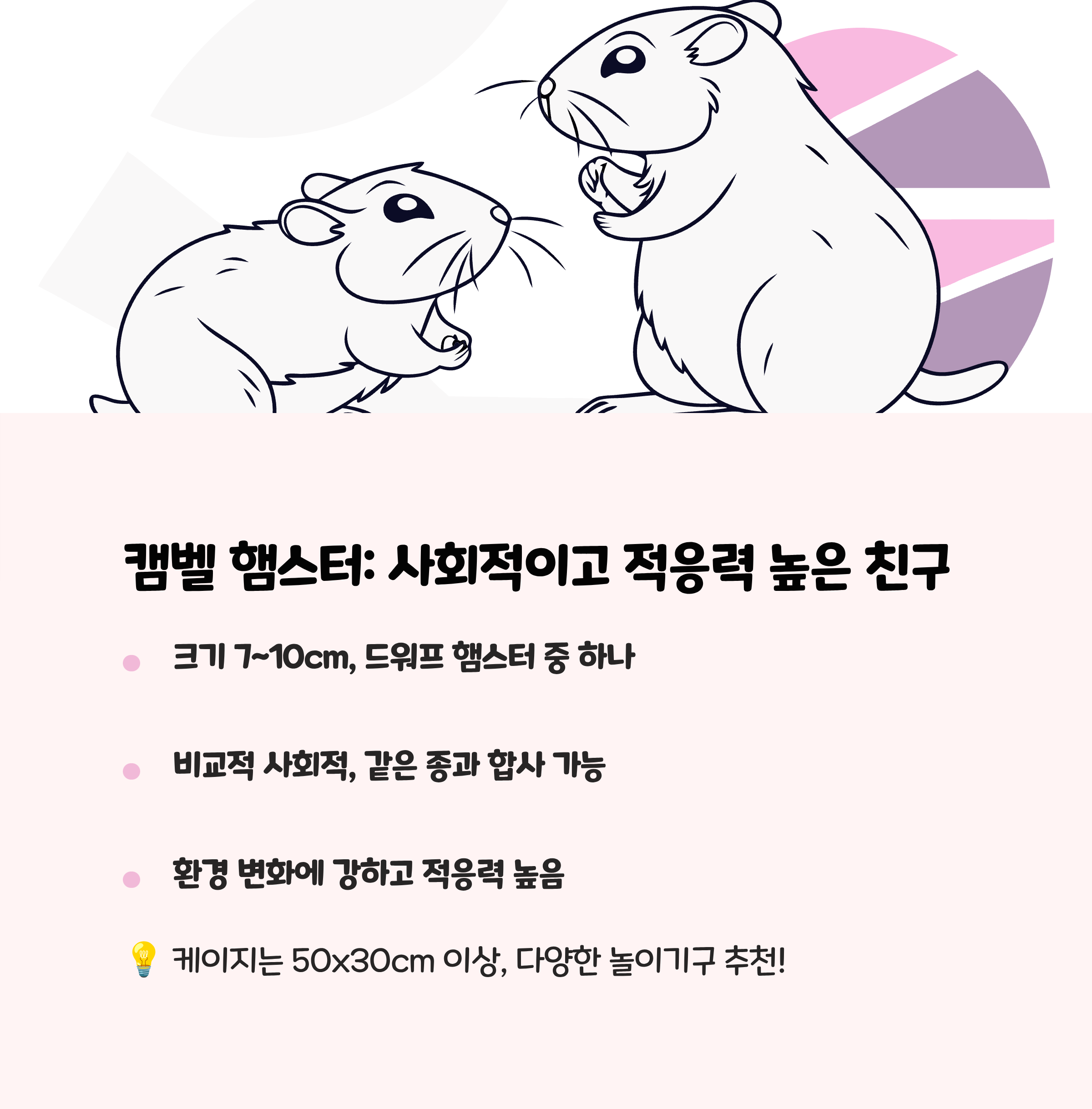 | 캠벨 드워프 햄스터 | 사회적이고 적응력 좋음 | 같은 성끼리 동거 가능 |