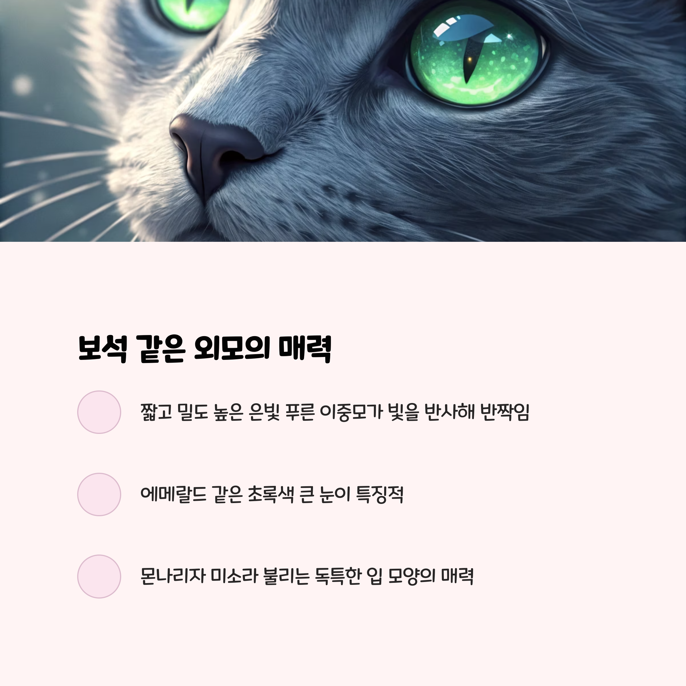 촘촘하고 윤기 나는 은회색 털, 성장하면서 두 번 바뀌는 눈동자(생후 2개월: 노란빛, 5~6개월: 녹색)가 특징입니다.