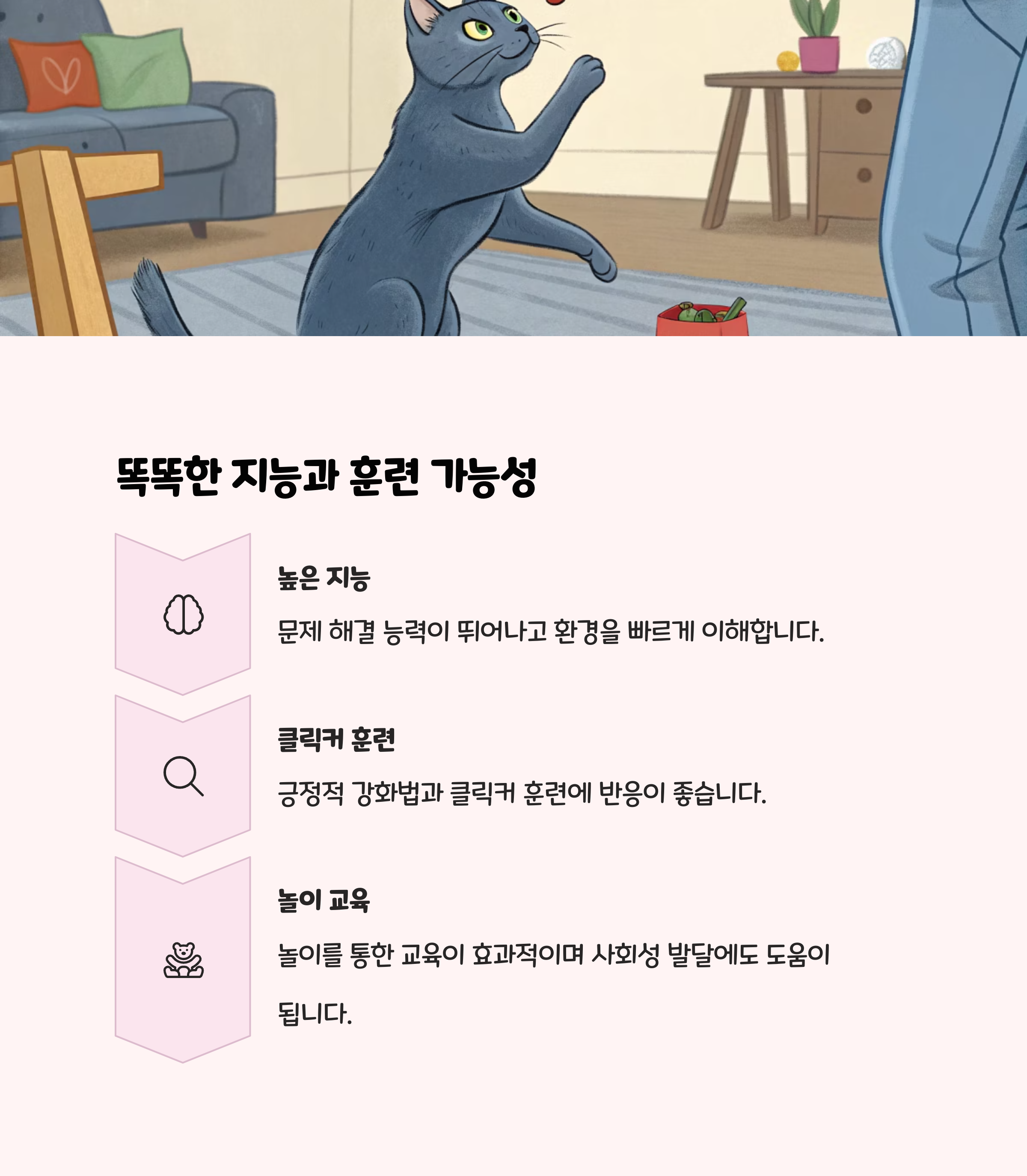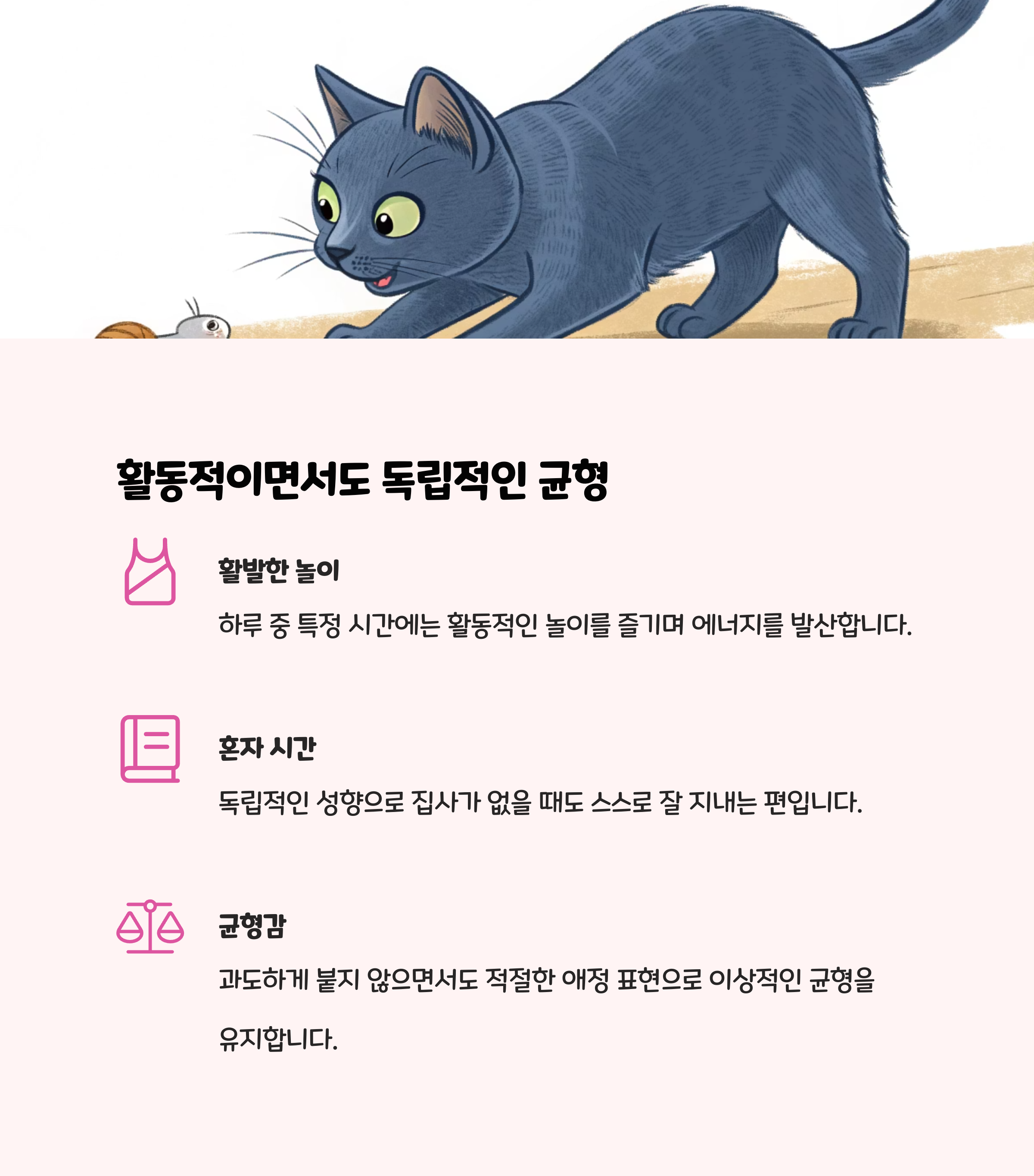 | 운동 필요성 | 활동적, 장난감·퍼즐·캣타워 필요 |