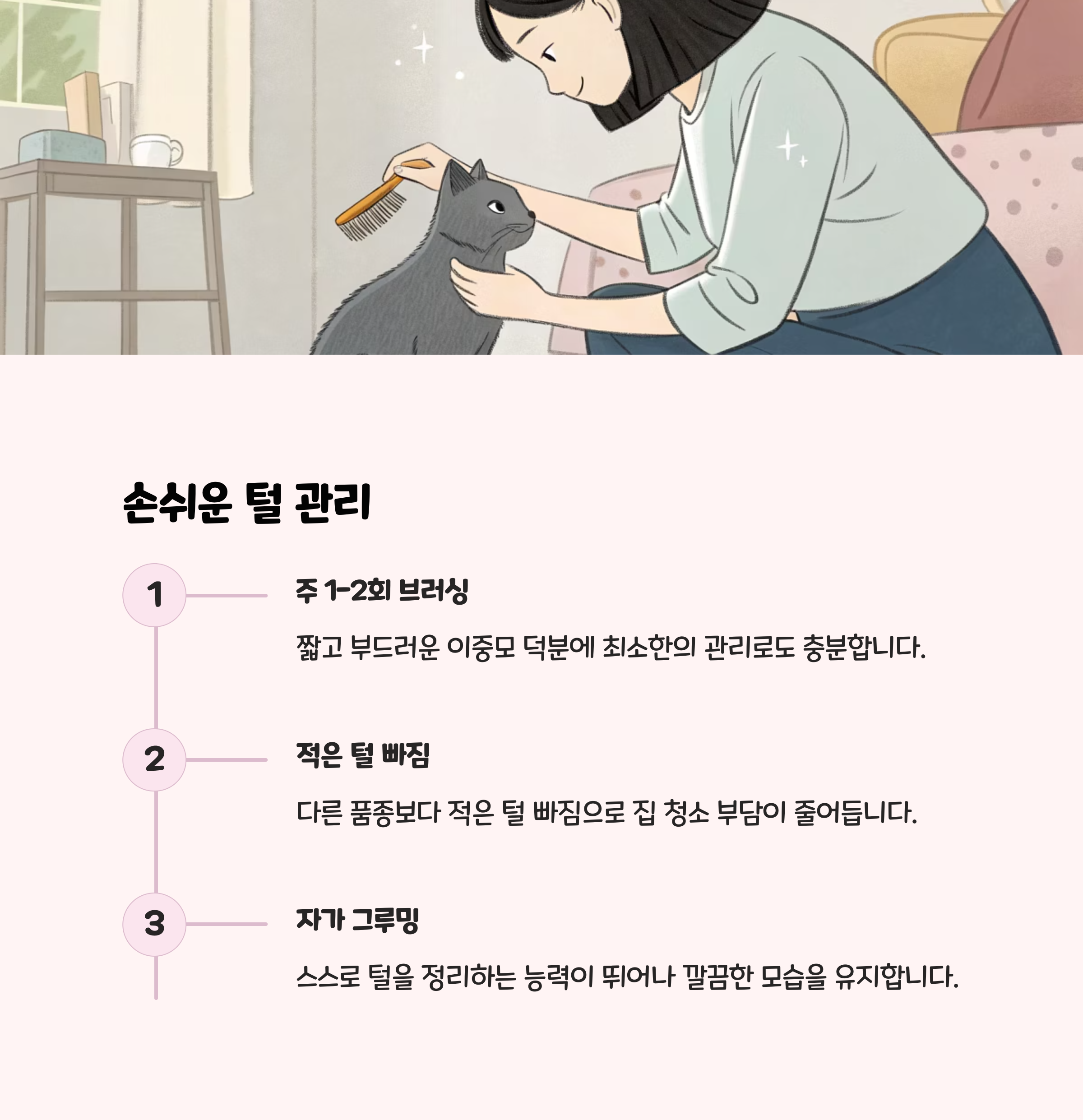 | 털 관리 | 주 1~2회 빗질, 이중모, 털 빠짐 적음 |