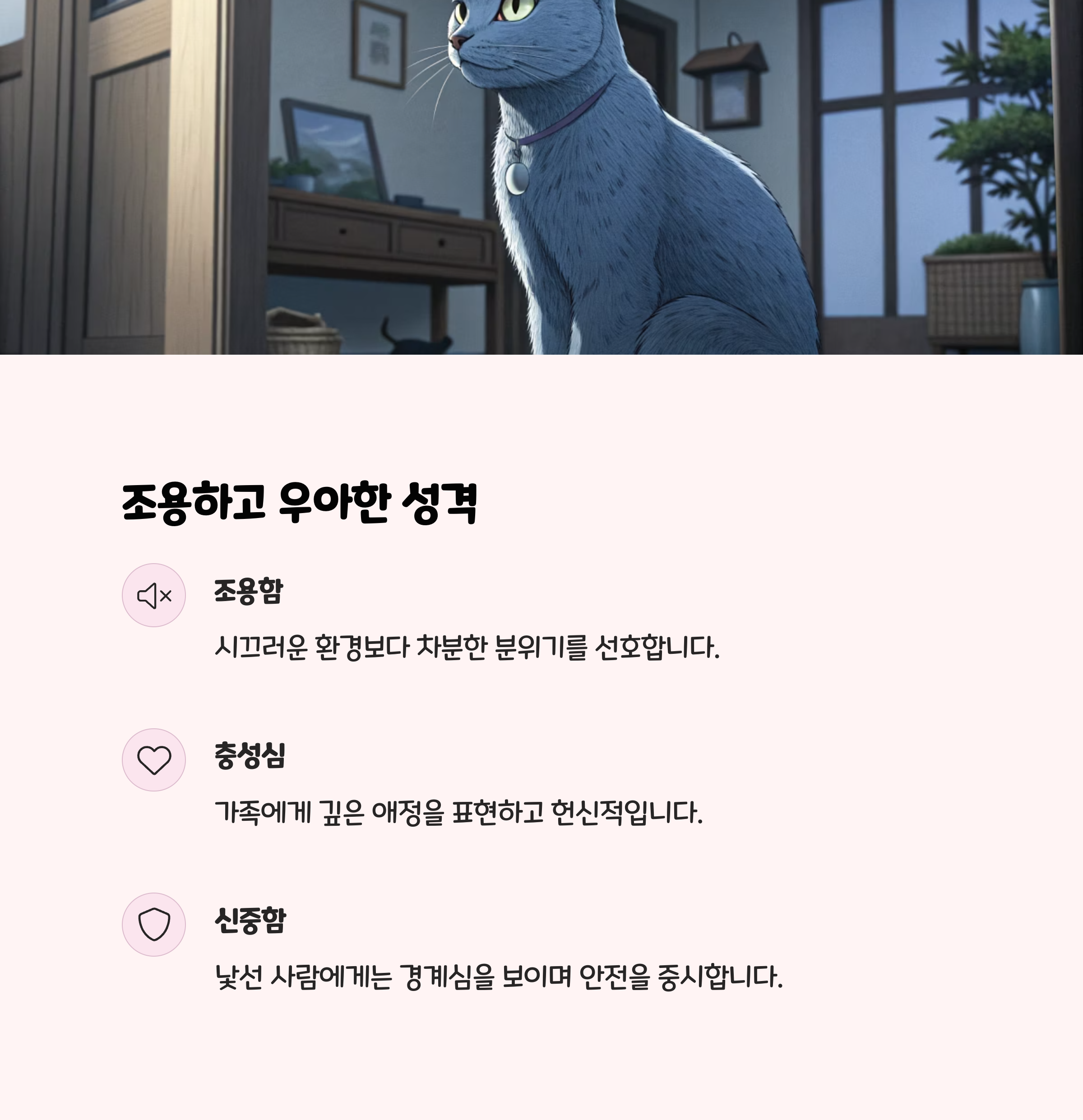 | 성격 | 온순, 조용, 낯가림, 애정 깊음 |