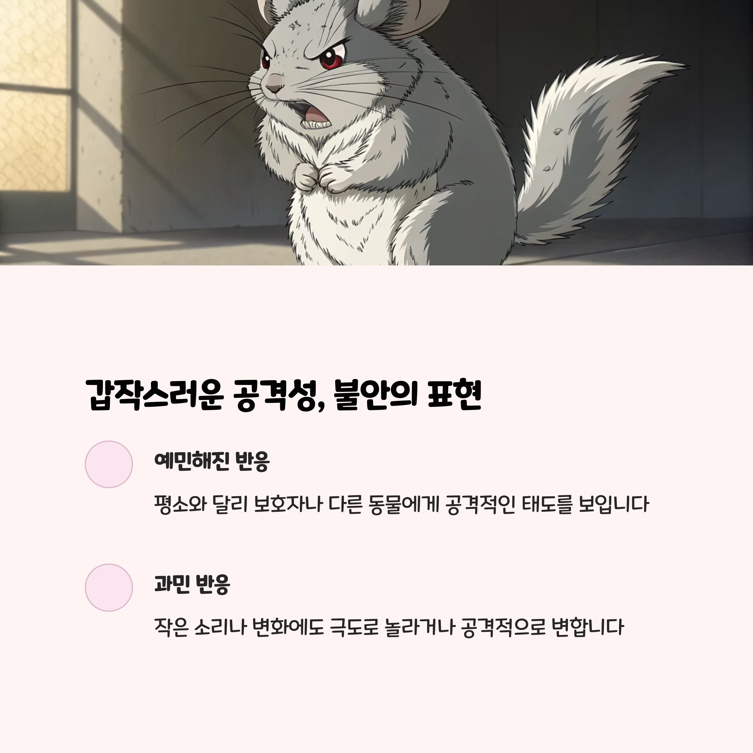 케이지 내에서 물건을 물어뜯거나, 오줌 마킹, 보호자나 다른 친칠라를 공격하는 행동이 나타날 수 있습니다. 이는 불안과 스트레스가 극에 달했을 때 보이는 신호입니다.