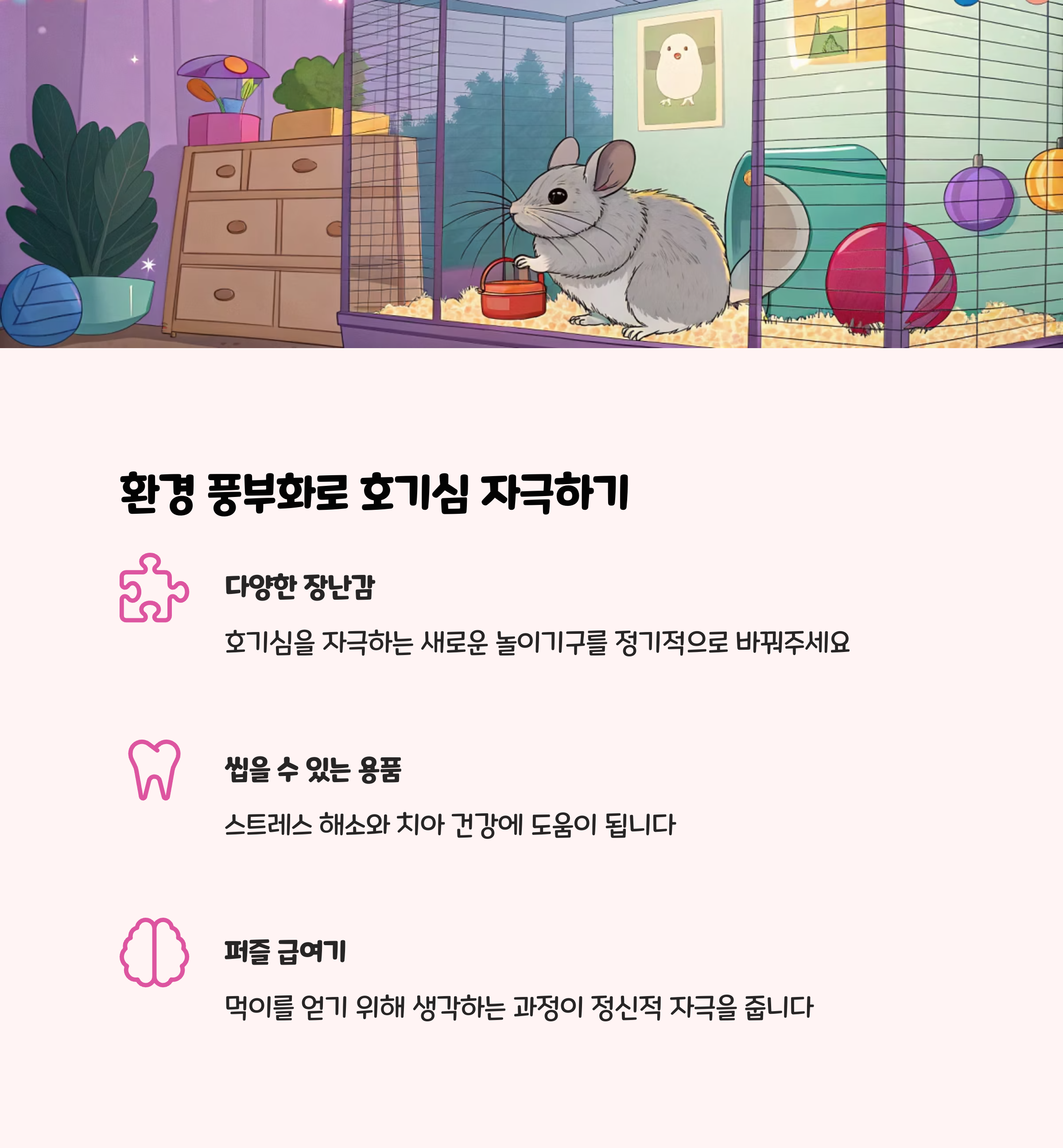 환경 풍부화란 친칠라가 지루하지 않도록 다양한 자극을 제공하는 것을 의미합니다. 장난감, 터널, 숨을 수 있는 구조물, 씹을 수 있는 나무 등 다양한 환경적 요소를 케이지에 추가하면 스트레스가 줄고, 분리불안 완화에도 도움이 됩니다. 주기적으로 환경을 바꿔주는 것도 좋습니다.