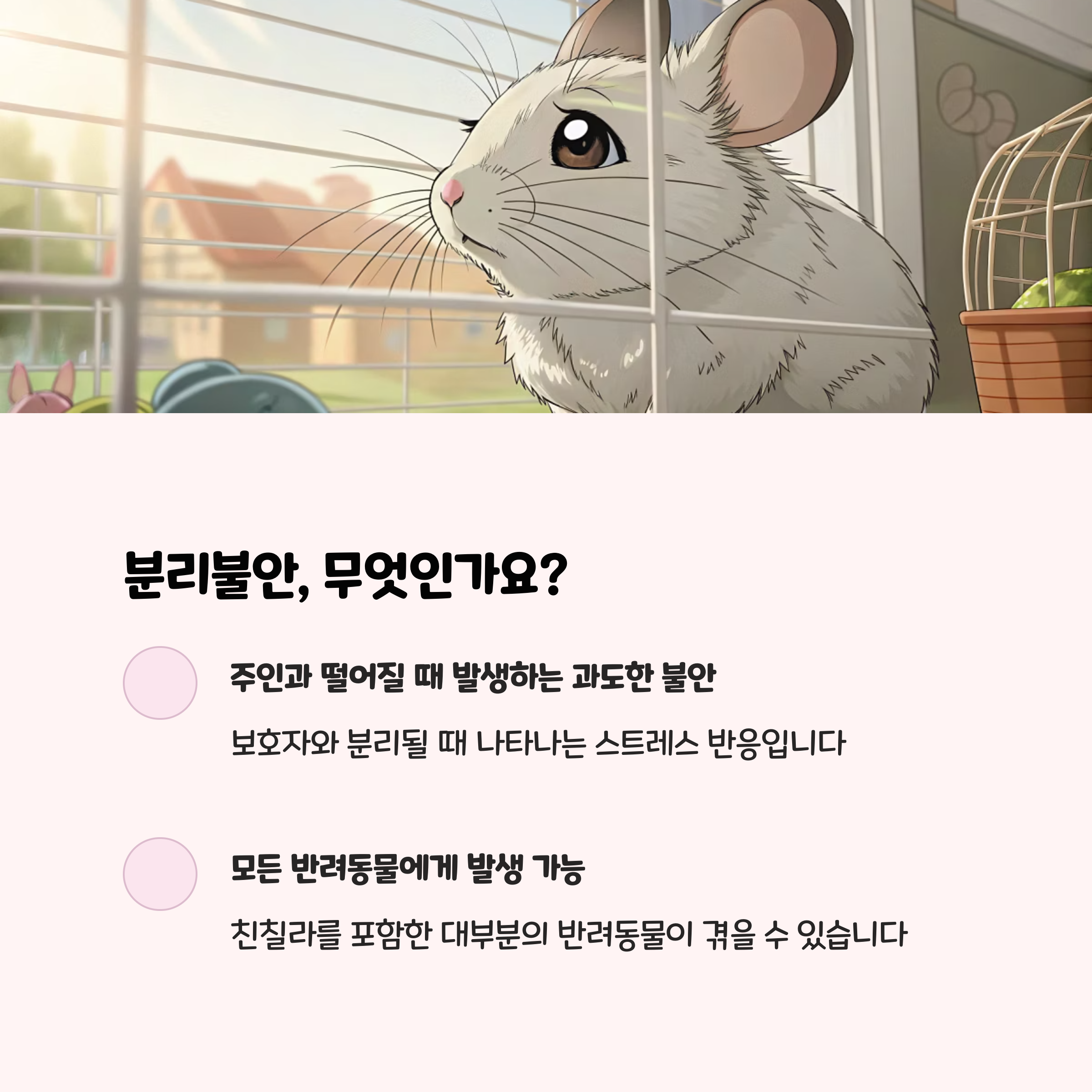 친칠라를 키우다 보면 예상치 못한 행동 변화나 스트레스 신호에 당황하는 경우가 많습니다. 특히 분리불안은 친칠라가 보호자와 떨어질 때 극심한 불안과 문제 행동을 보이는 대표적인 심리적 문제입니다. 이 글에서는 친칠라의 분리불안 증상별로 세분화된 관리법을 안내해, 보호자 여러분이 실질적인 해결책을 찾도록 돕겠습니다.